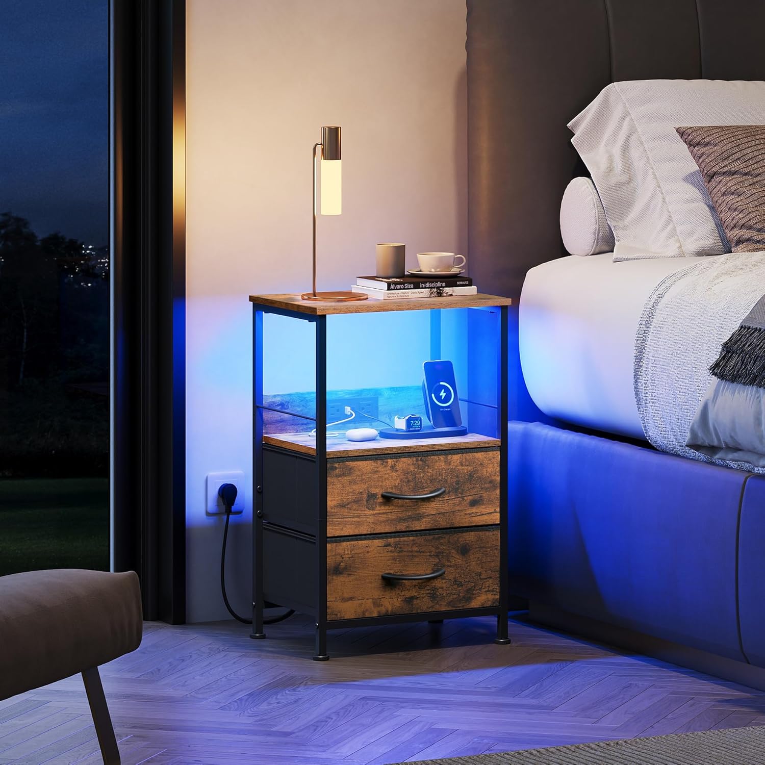 WLIVE Night Stand Set of 2 with Charging Station, LED Nightstand Sets with 2 Fabric Drawers and Storage Shelf, Small Bedside Tables for Small Spaces, Dresser for Bedroom, Rustic Brown
