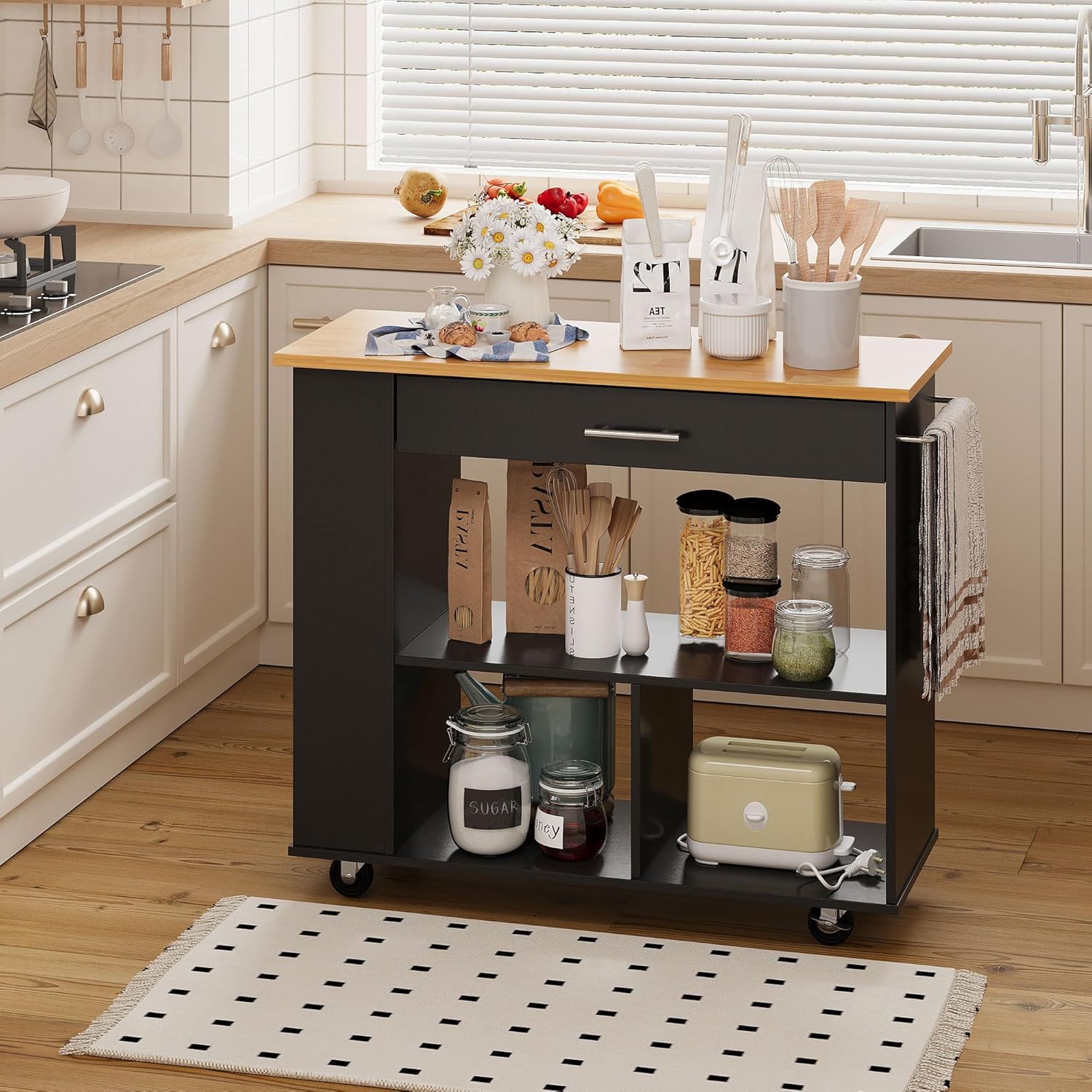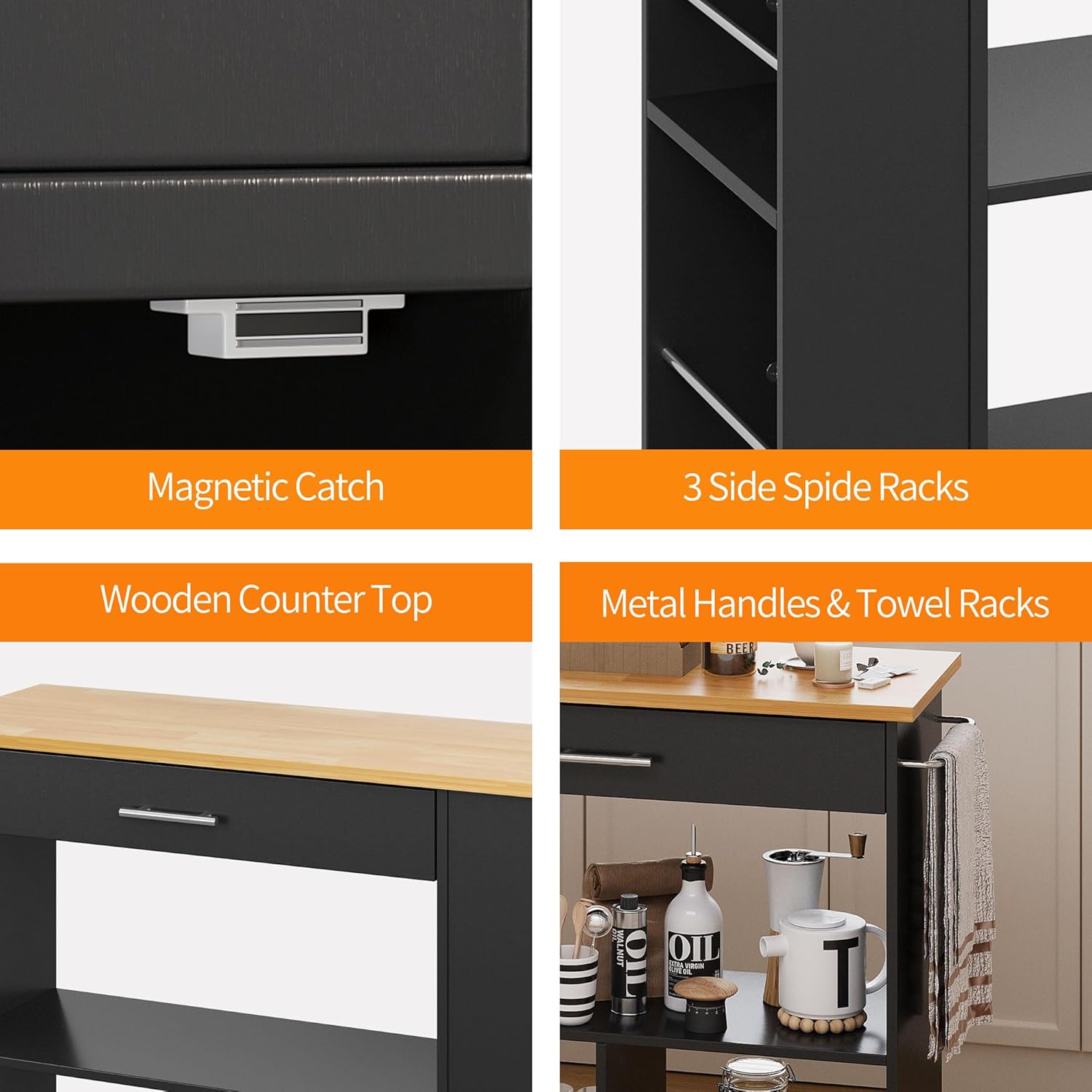 Shintenchi Kitchen Island on Wheels with Storage, Wheeled Island & Cart with 3-Tier Spice Rack, 3 Open Shelves and 1 Drawer, Black