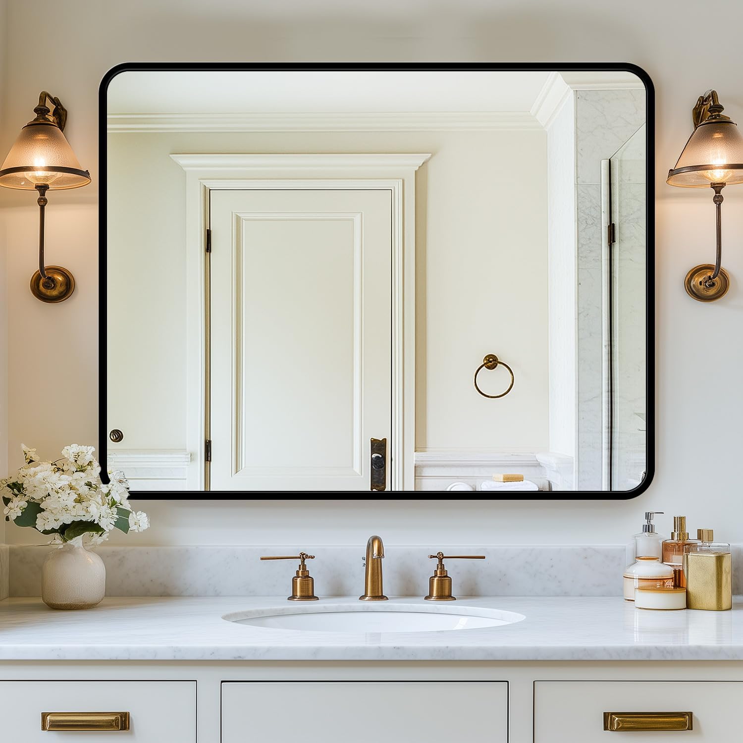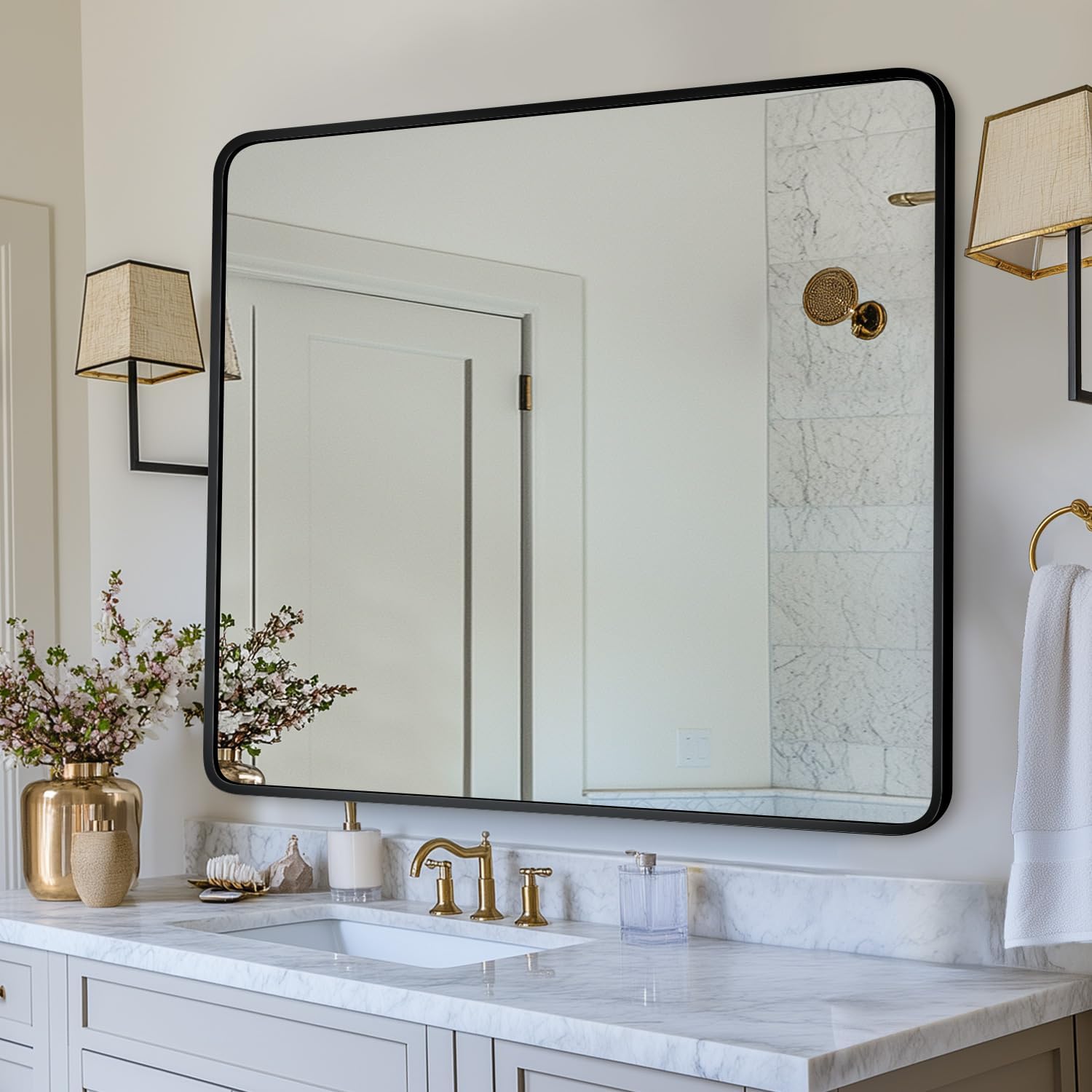 Bathroom Mirror, 40" x 30" Wall Mirror, Rectangular Aluminum Alloy Frame Contemporary Hanging Mirror for Living Room Bathroom Entryway, Black Rounded Corner