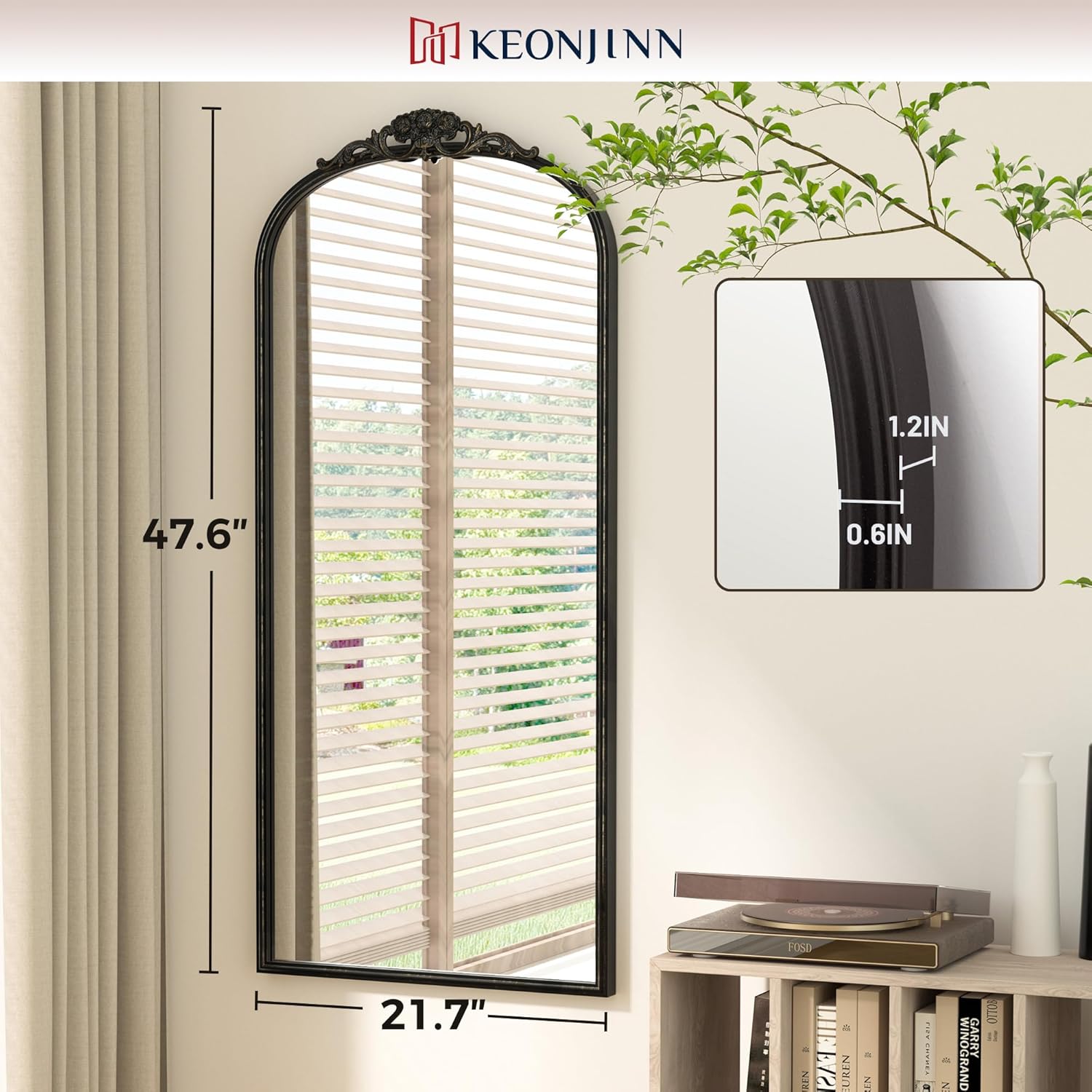 Keonjinn Arched Wall Mirror, 48" x 22" Vintage Mirror Full Length, Black Traditional Decoration Baroque Style, Ornate Mirrors for Hallway, Fireplace, French Cleat Mounting