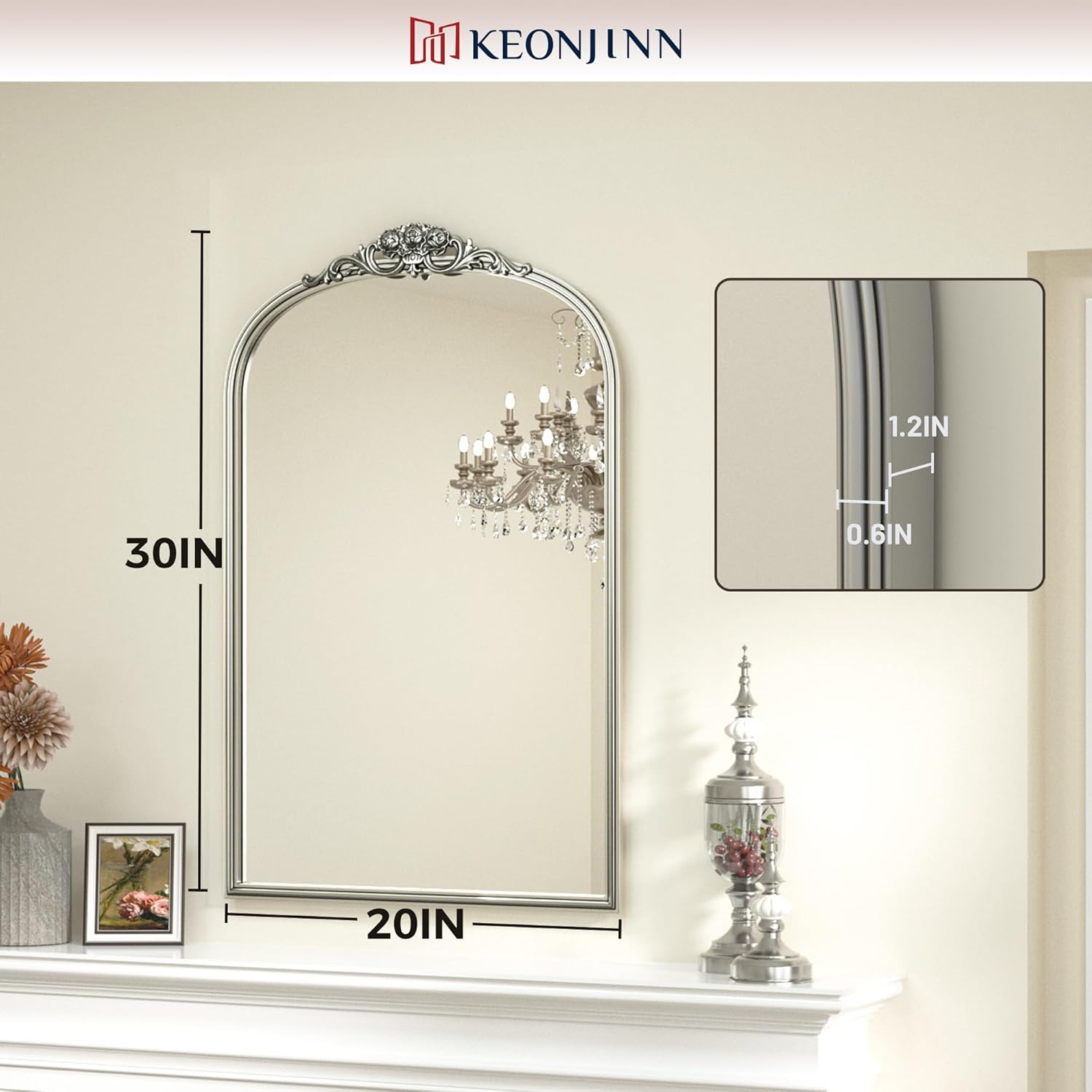 Keonjinn Vintage Arched Mirror for Wall, 20" x 30" Silver Mirror with Metal Frame, Ornate Vanity Mirror, Baroque Arch Mirror, Decorative Brass Mirror for Mantle, Living Room, French Cleat Mounting