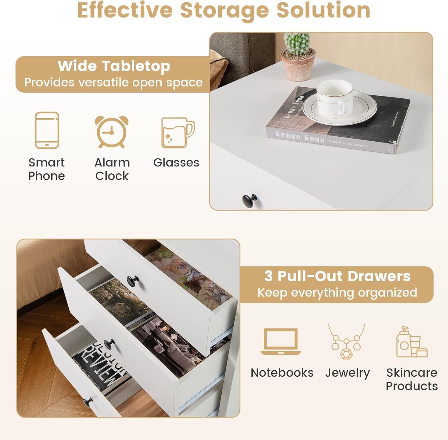 KOMFOTT 3 Drawers Nightstand, Wooden Bedside Table, Modern Sofa Side End Table, Space-Saving Telephone Table, Chest of Drawers for Living Room, Bedroom & Office (1, White)