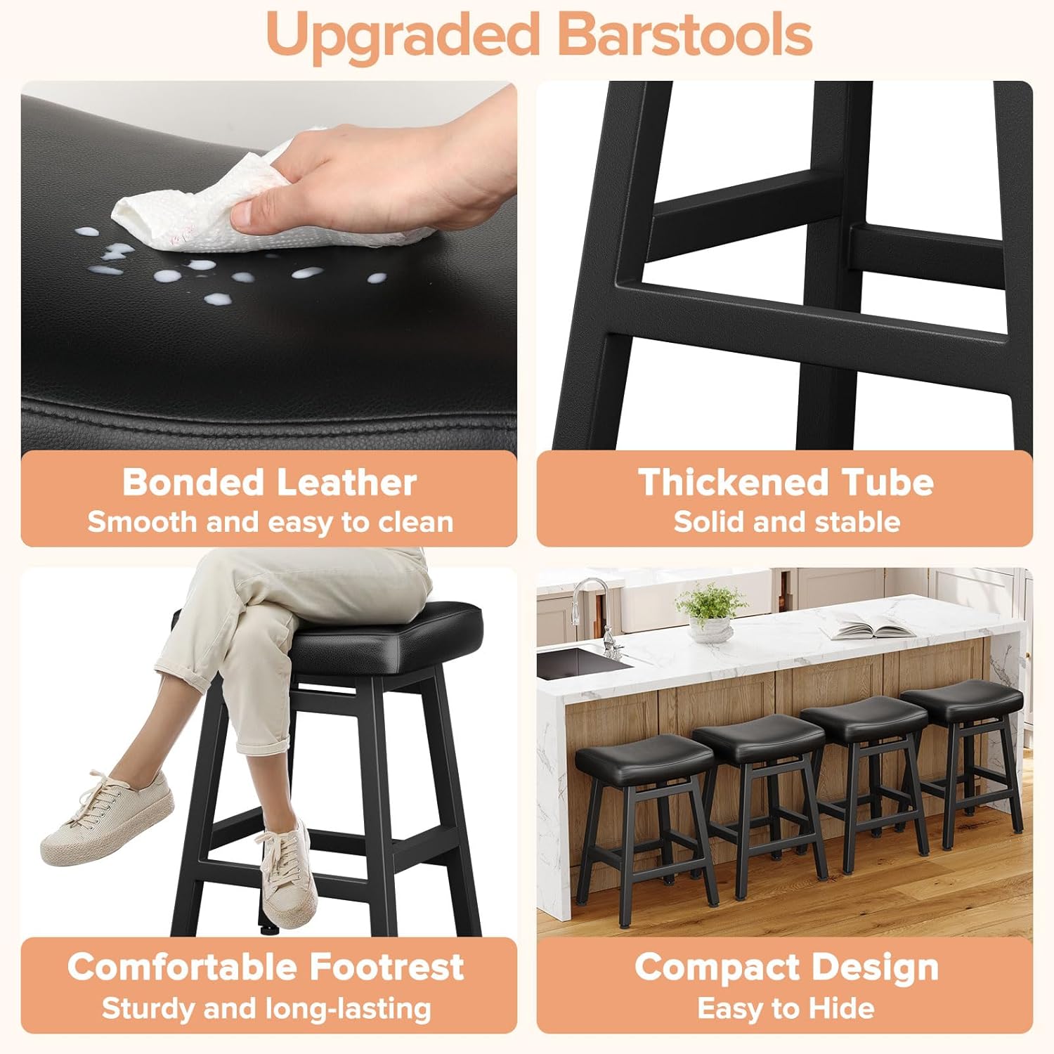 Counter Height Bar Stools Set of 3, 24 Inch Barstools for Kitchen Counter, Kitchen Stools with Bonded Leather Saddle Seats & Heavy Duty Metal Legs, Easy Assembly, All Black
