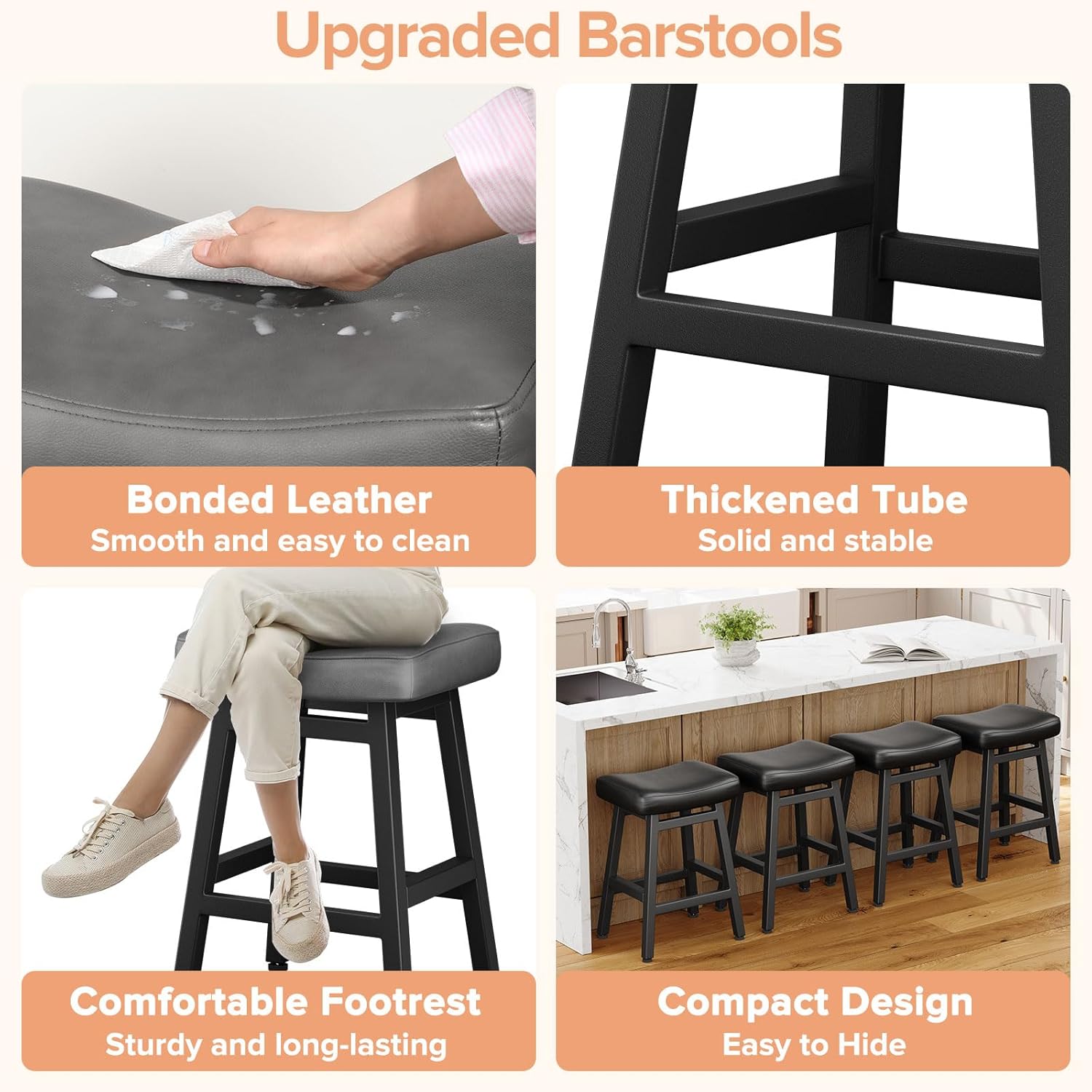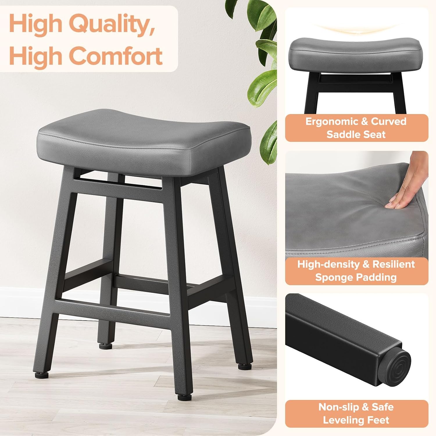 Counter Height Bar Stools Set of 3, 24 Inch Barstools for Kitchen Counter, Kitchen Stools with Bonded Leather Saddle Seats & Heavy Duty Metal Legs, Easy Assembly, Gray/Black