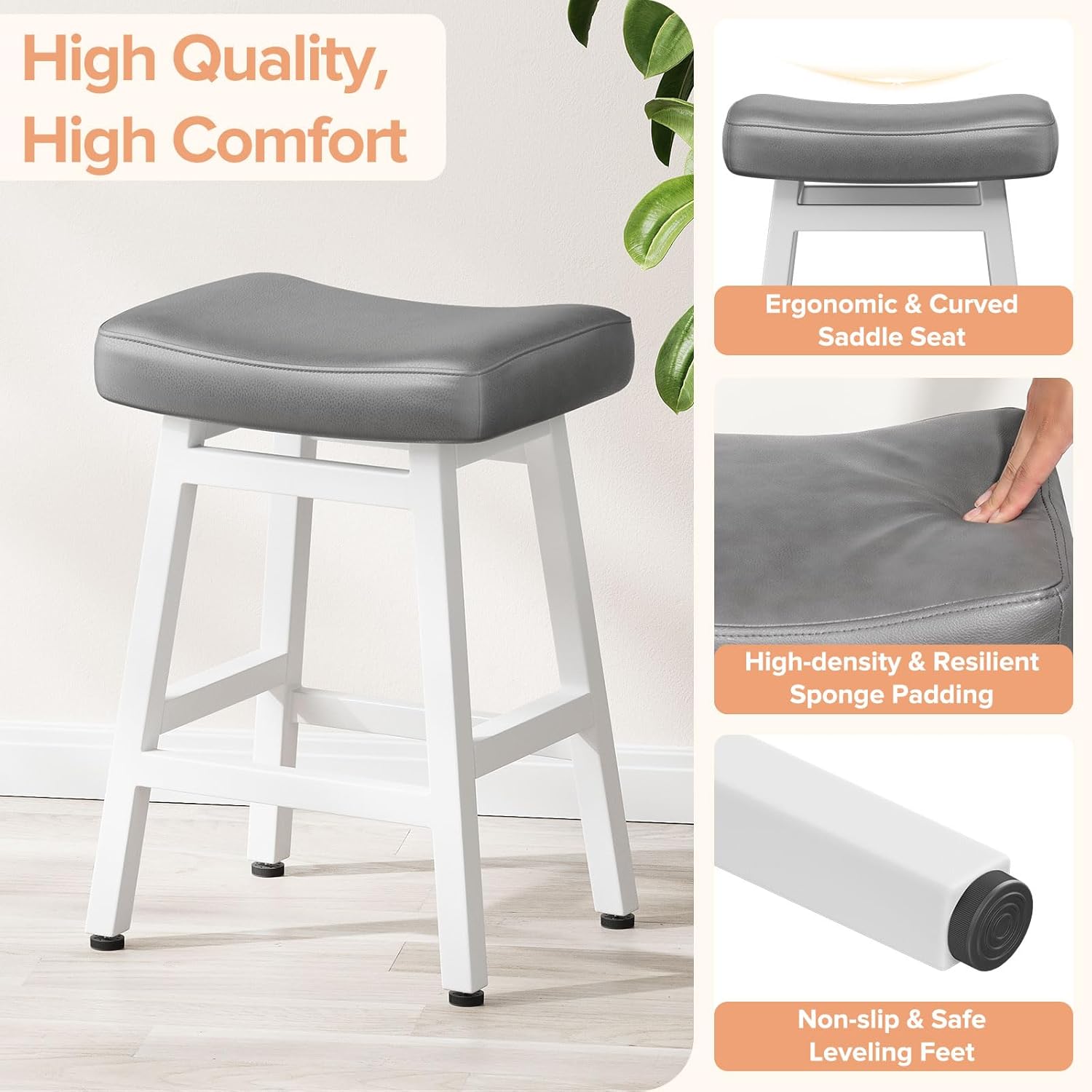 Counter Height Bar Stools Set of 3, 24 Inch Barstools for Kitchen Counter, Kitchen Stools with Bonded Leather Saddle Seats & Heavy Duty Metal Legs, Easy Assembly, Gray/White