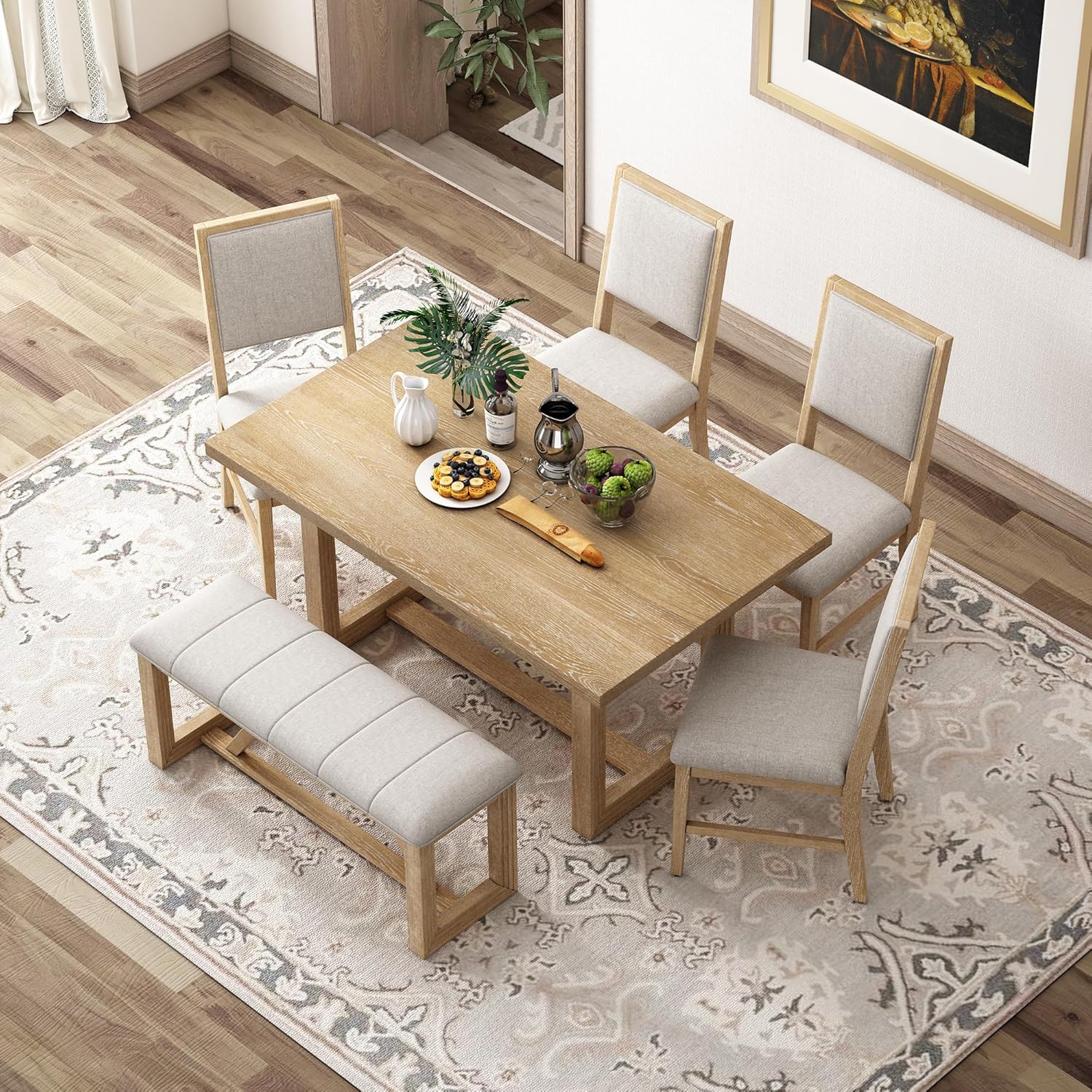 Merax Farmhouse Wood 6-Piece Dining Set, 59.6 inch Rectangular Table, 4 Upholstered Chairs and 1 Bench for Kitchen, Natural