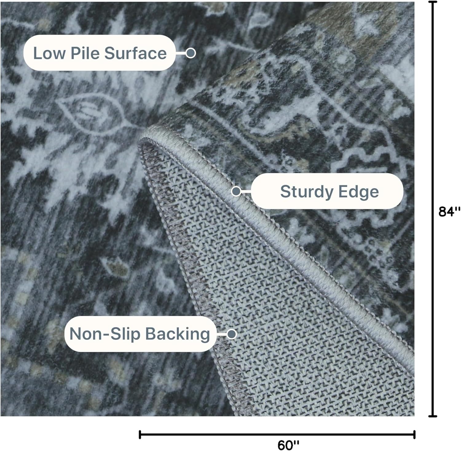GENIMO 5x7 Area Rugs for Living Room, Machine Washable Non Slip Vintage Rugs, Low Pile Lightweight Chenille Print Rug for Bedroom, Dining Room, Home Office,Dark Gray