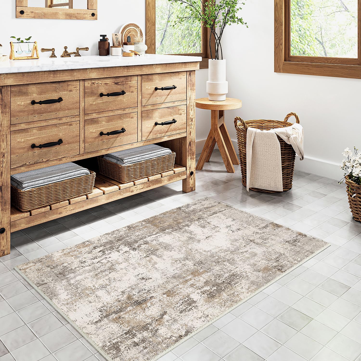 2x3 Washable Area Rug Brown Grey Neutral Abstract Entryway Kitchen Non Slip Low Pile Throw Rug Living Room Bedroom Indoor Doormat Small Soft Carpet for Entrance Bathroom