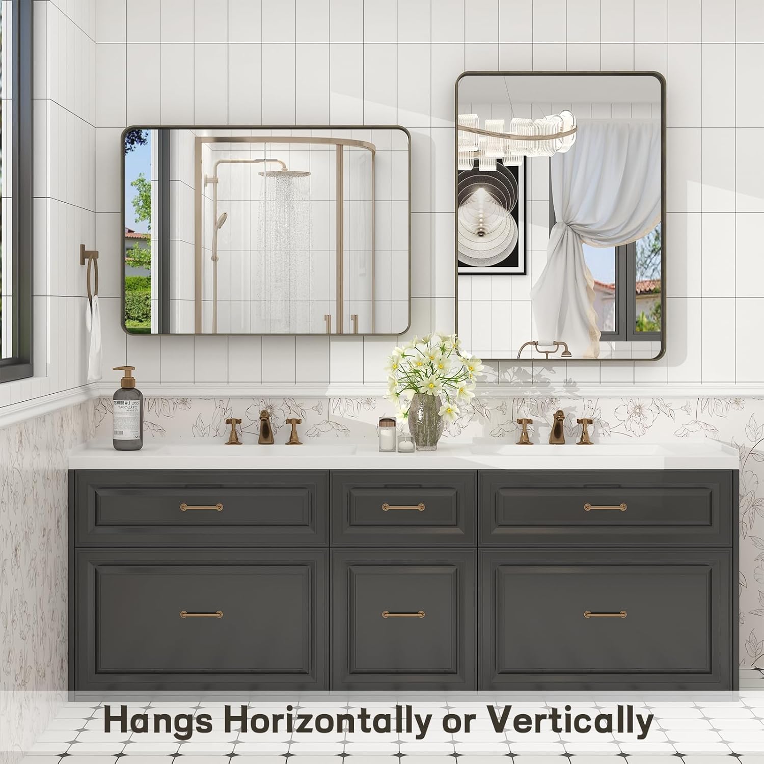 - 【Durable Bronze Brushed Frame】VANLIO Bronze bathroom mirror features a rustproof aluminum alloy frame that resists corrosion and warping. The brushed texture and rounded corners create a modern-industrial look, while versatile sizing fits bathrooms, vanities, farmhouse decor, bedrooms, living rooms, dining areas, entryways, or above fireplaces.