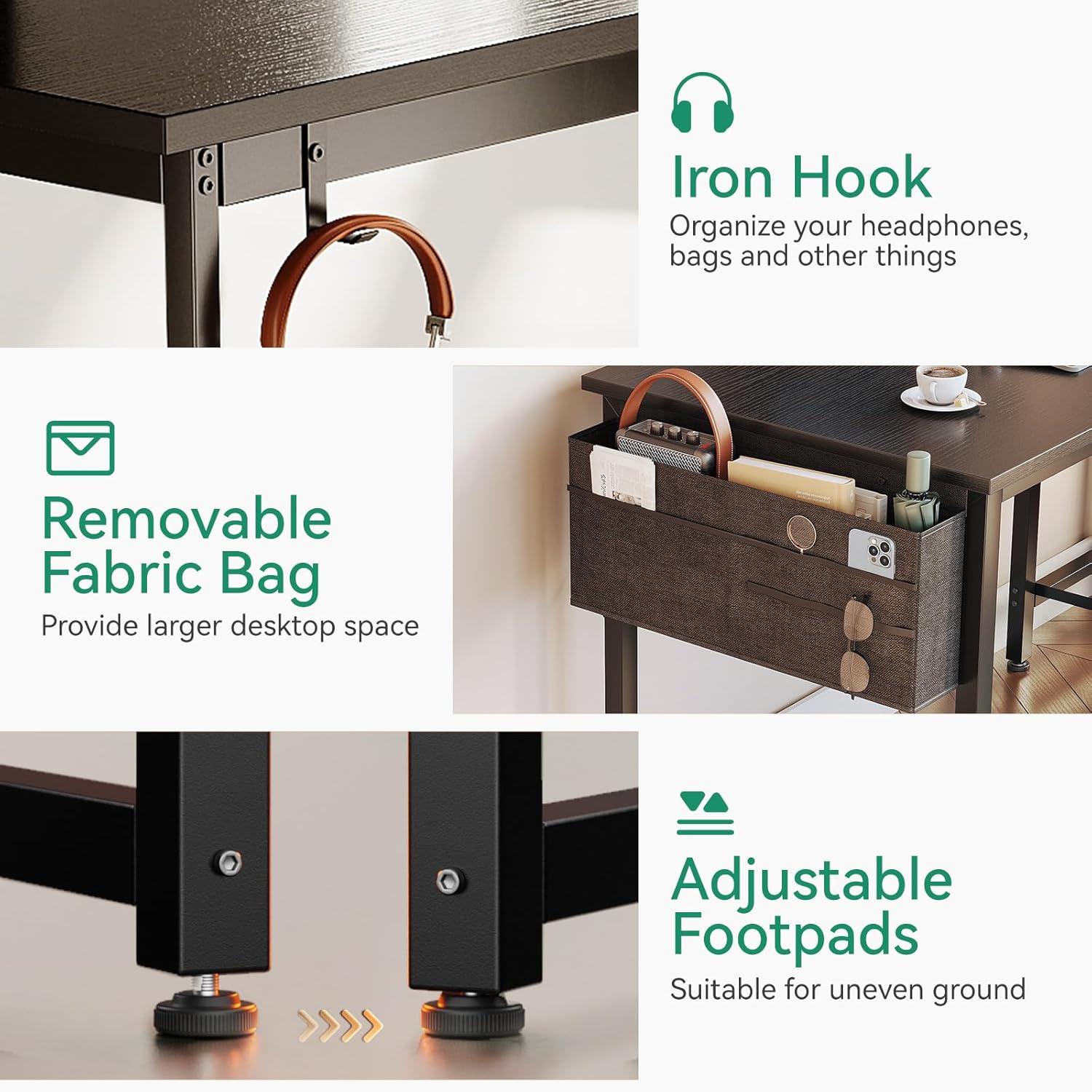 - 【Hook & Cloth Storage Bag】 A versatile hook is perfect for hanging headphones, bags, and other useful gadgets, keeping everything easily accessible and organized. The bag can be used to organize books and files, ensuring a orderly desktop. Bag and hook are reversible.