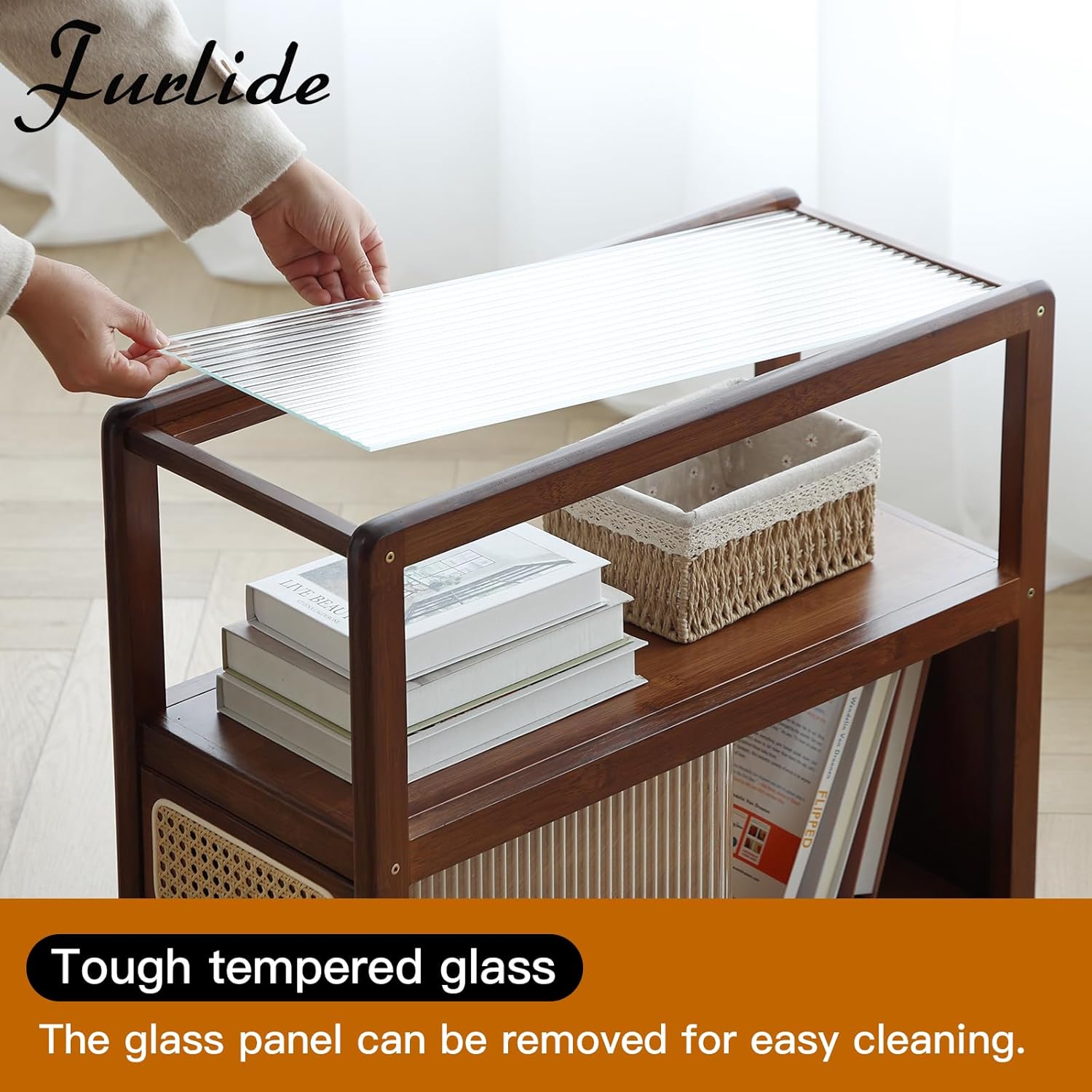 Rattan Nightstand Side Table with Storage, Bamboo Nightstand Bedside Table, Glass Mid Century Modern End Tables for Small Spaces, Living Room, Bedroom,Walnut