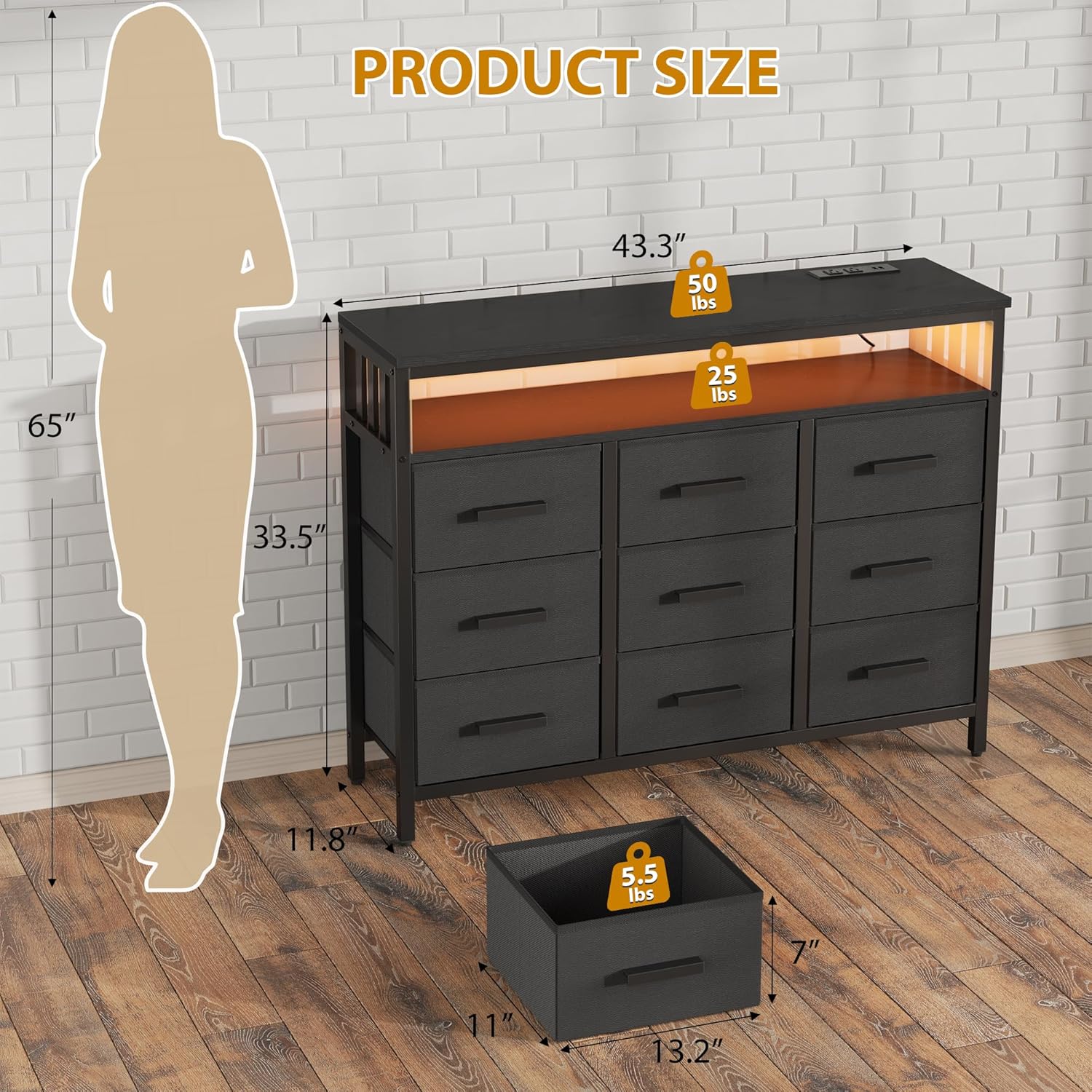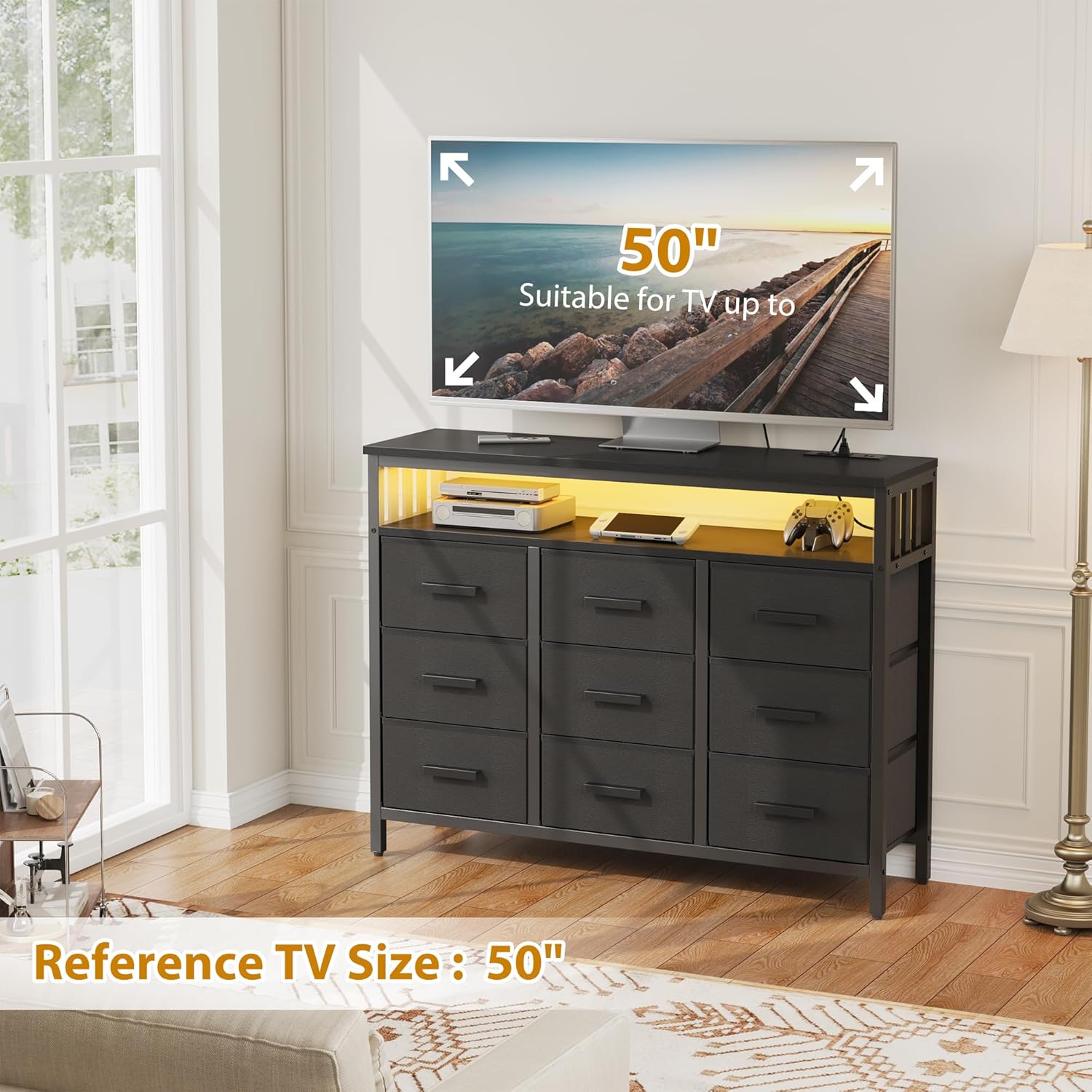 9 Drawer Dresser TV Stand with LED Lights & Power Outlets, Entertainment Center with Open Shelf, Media Console for 50” TV, Large Storage Dresser for Bedroom (Black)