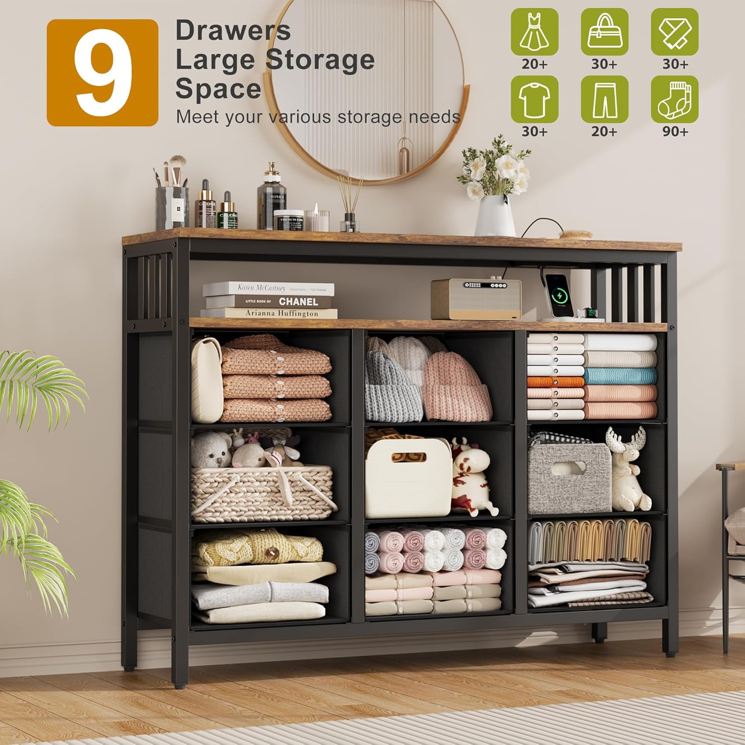 - Dresser with Power Outlets: Our 9 drawers TV entertainment center comes with 2 AC outlets and 2 USB ports, turning it into a charging hub for your TV, Wi-Fi router, and gaming gear. Keep everything organized on the open shelf, maintaining a clutter-free TV console table.