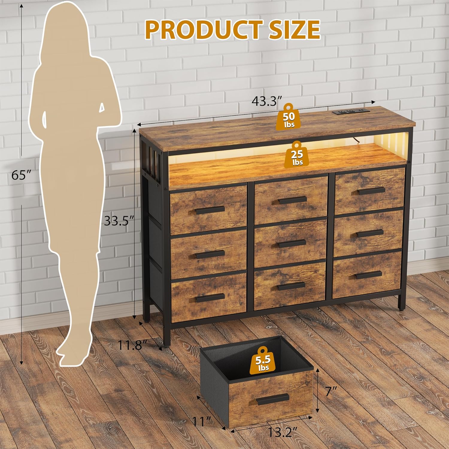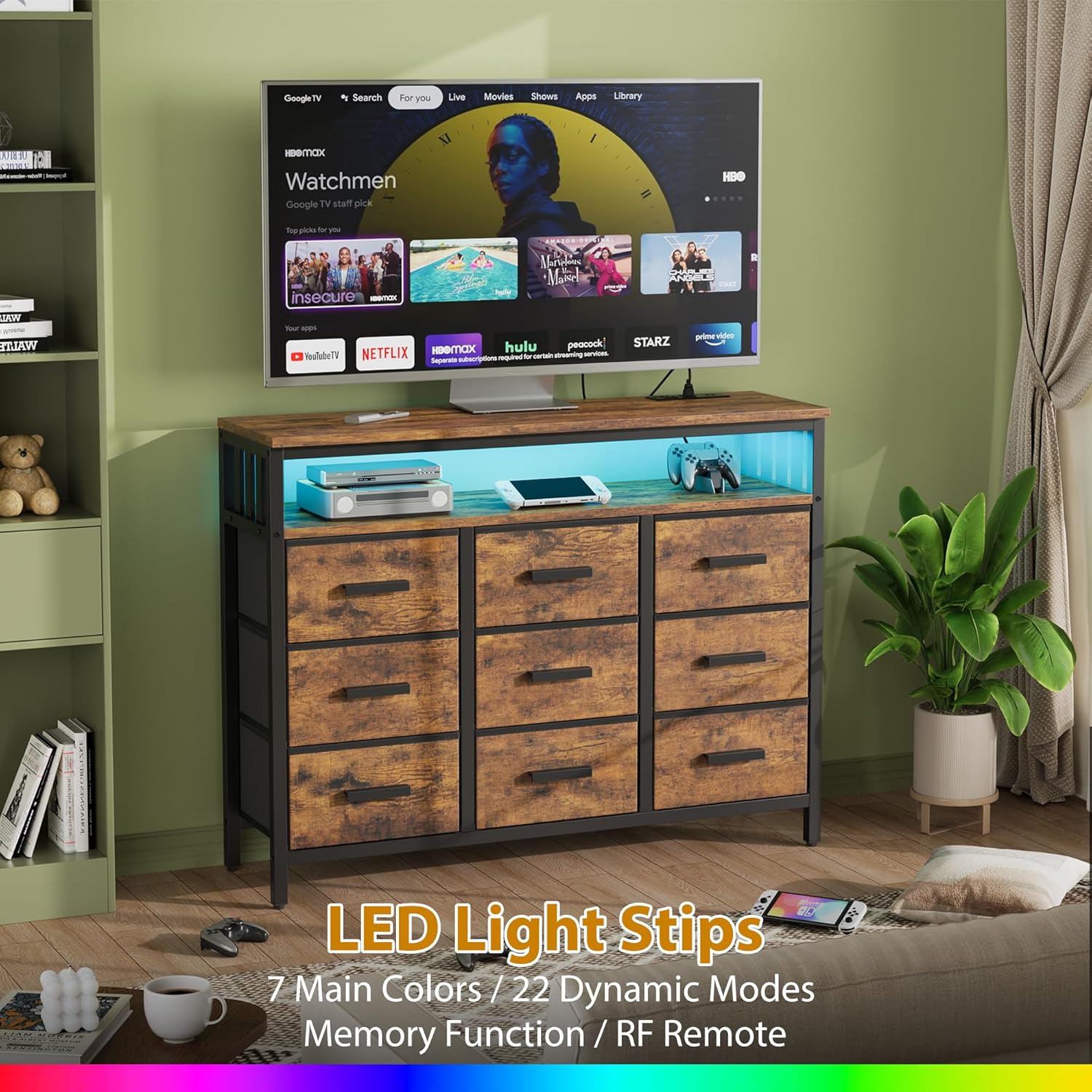 9 Drawer Dresser TV Stand up to for 50” TV with LED Lights & Power Outlets, Entertainment Center with Open Shelf, Media Console, Large Storage Dresser for Bedroom (Rustic Brown)