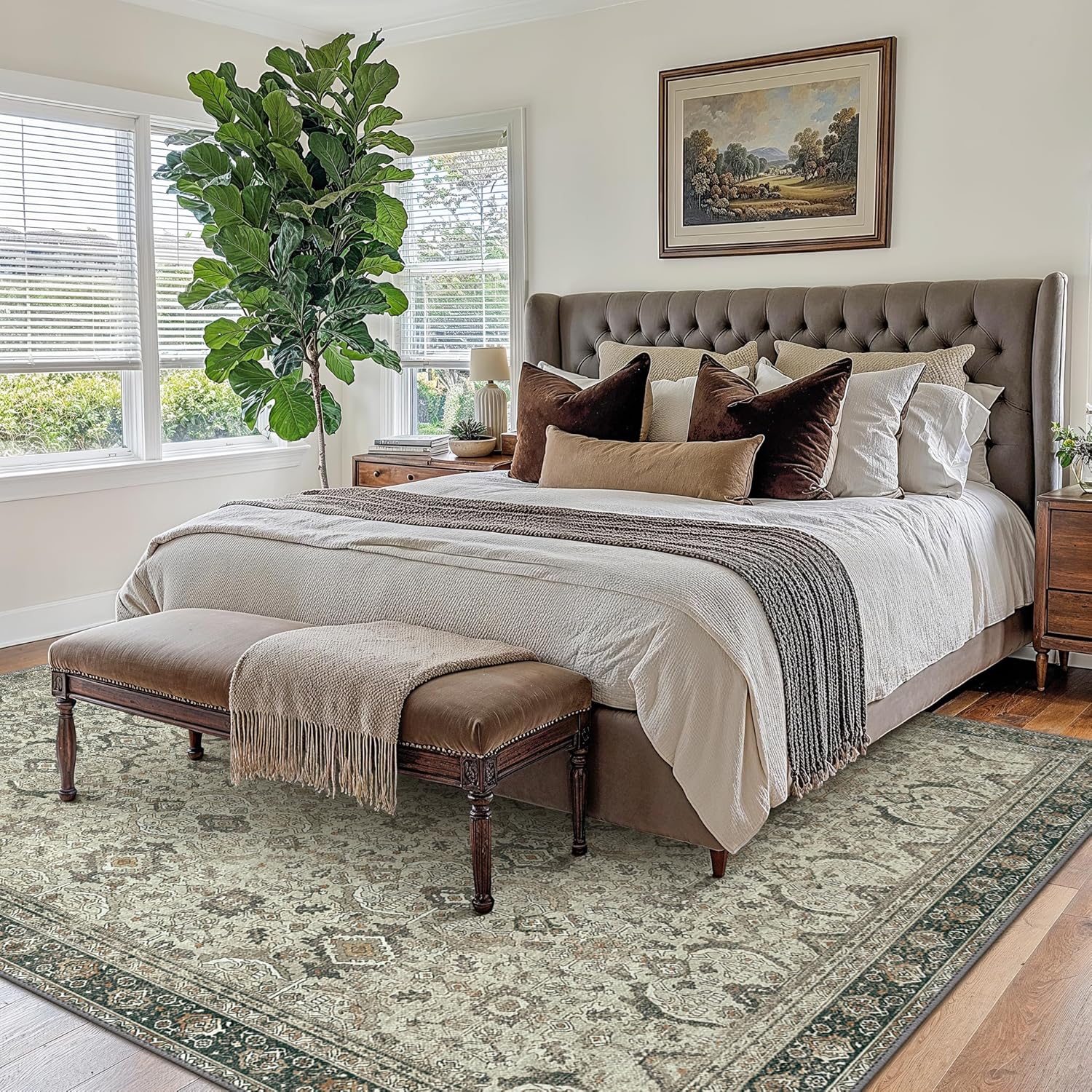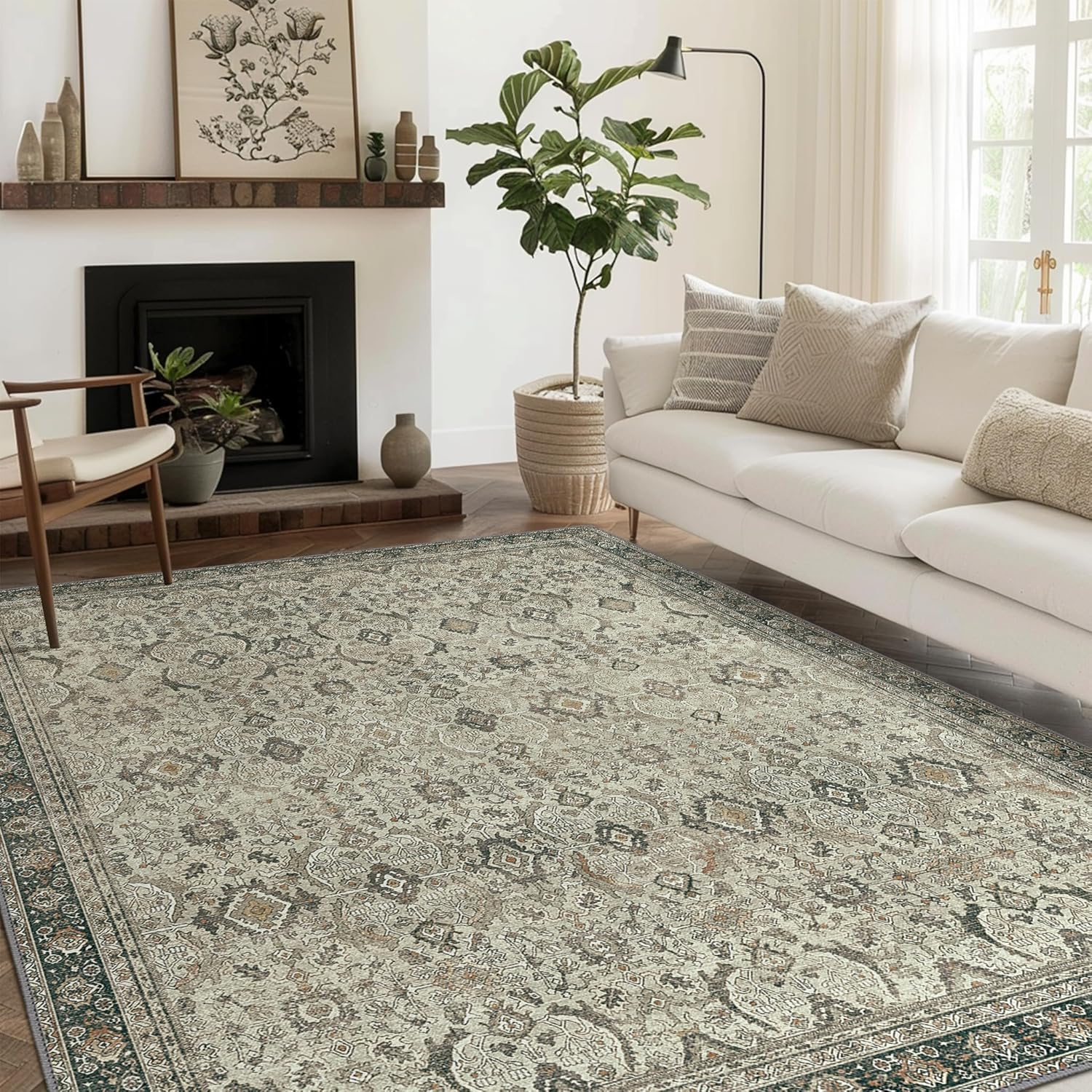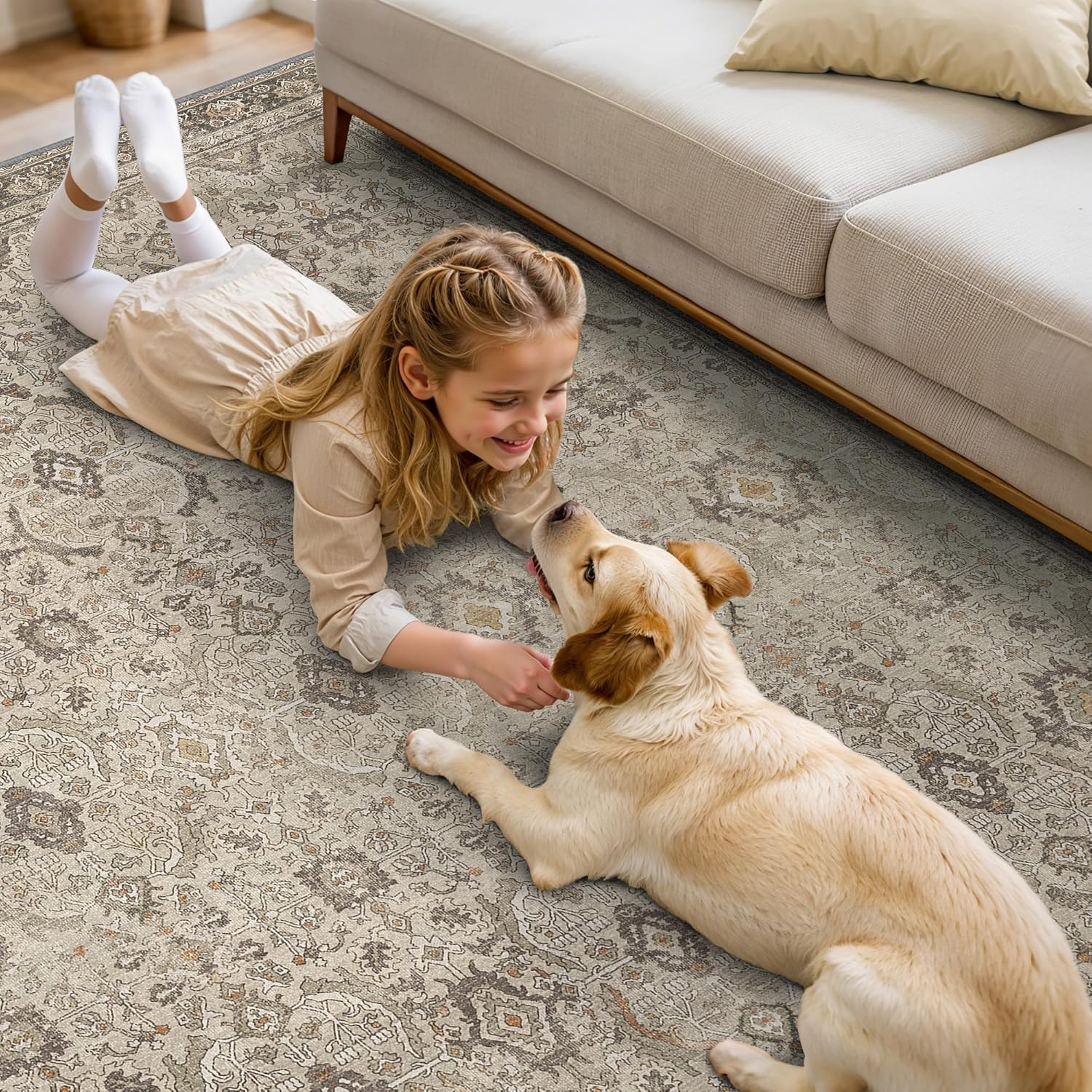 8X10 Area Rugs Machine Washable Rugs for Living Room, Vintage Boho Large Rugs for Bedroom Dining Room, Non Slip Indoor Soft Distressed Lightweight Thin Low Pile Carpet, Tan