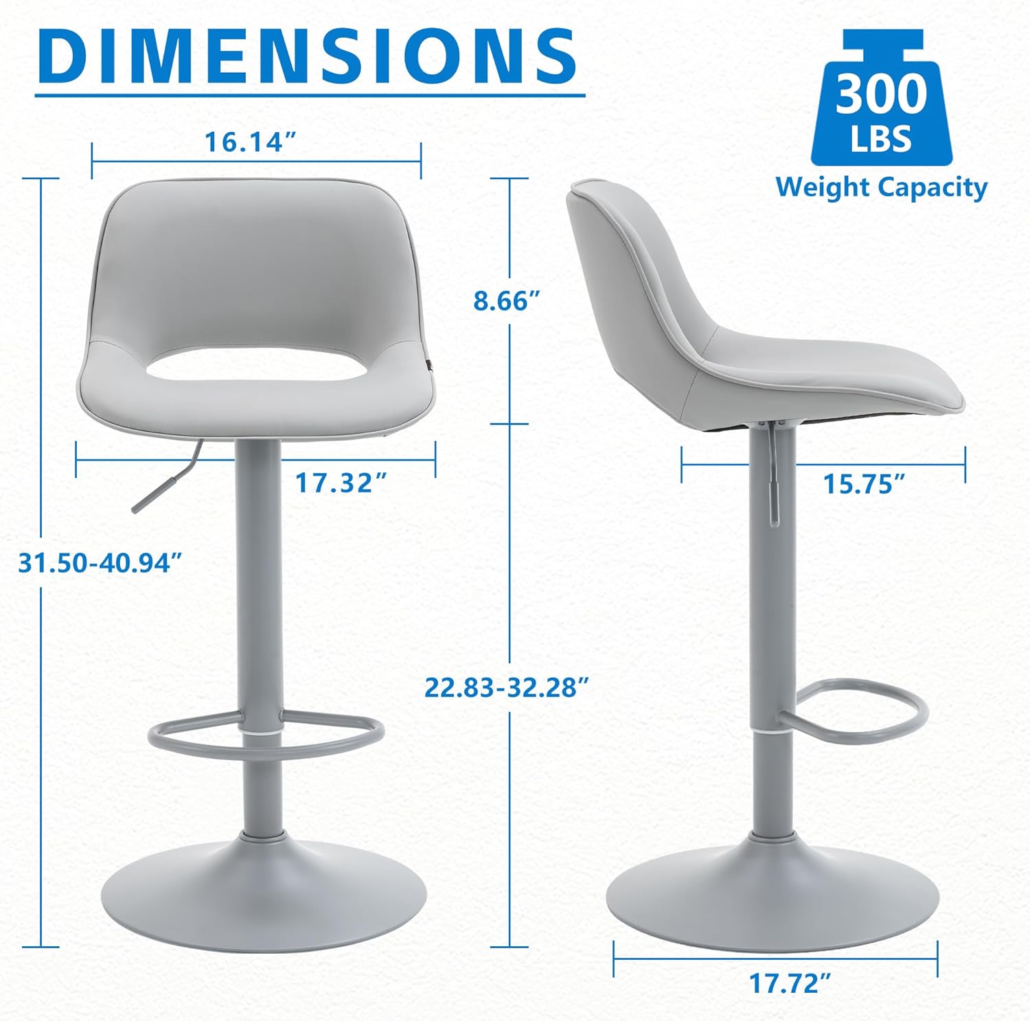 YOUNIKE Bar Stools Set of 2 All Grey Swivel Barstools, Adjustable Counter Height Bar Stools Faux Leather Upholstered Counter Stools with Hollow Back for Kitchen Island