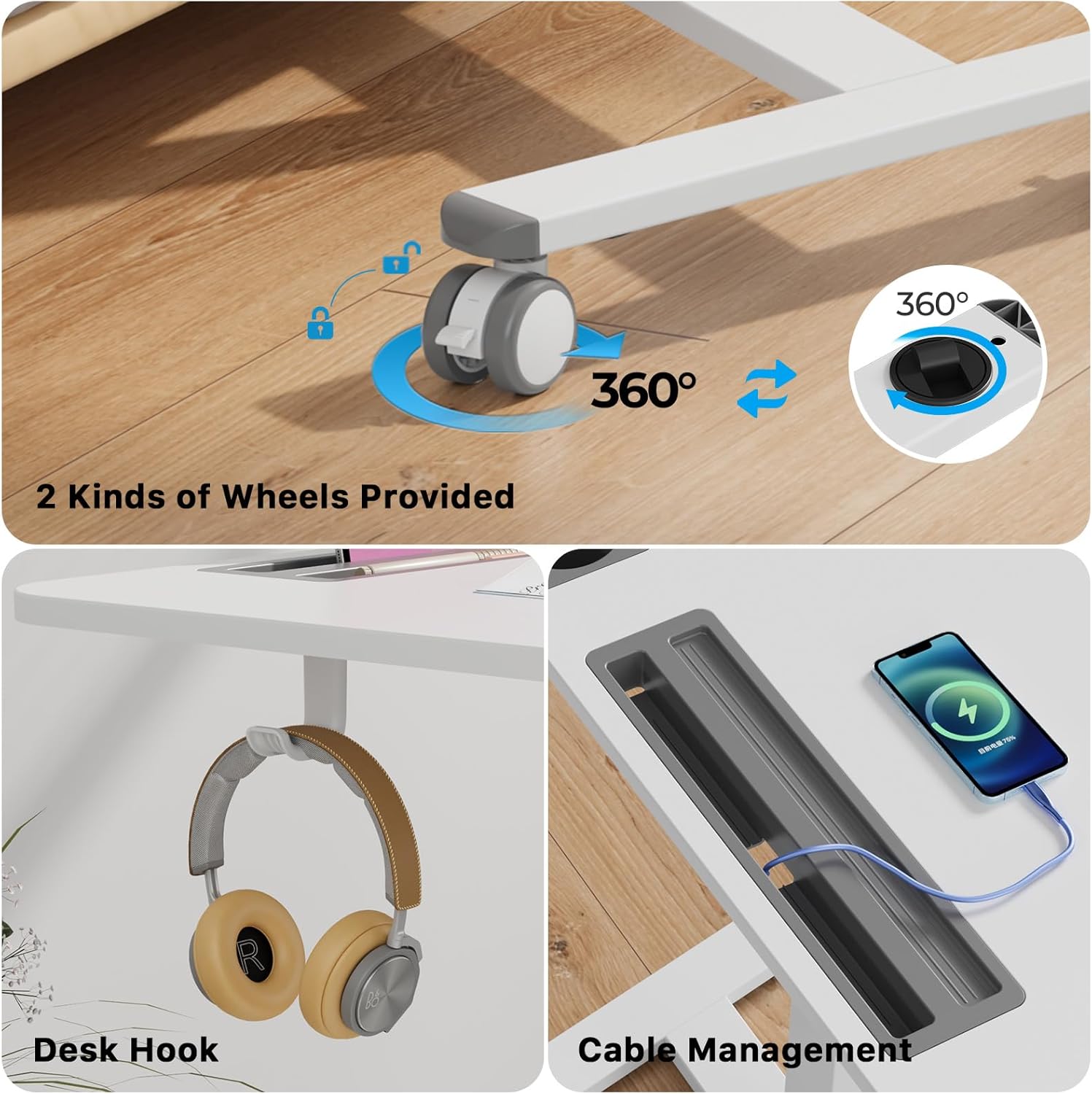 - 2 Types of Casters Available: Mobile Standing desk comes with 4 lockable casters enhance maneuverability on carpeted surfaces. And the low-profile base with hidden wheels tuck under the furniture at a minimum height of just 1.2”, optimizing valuable space