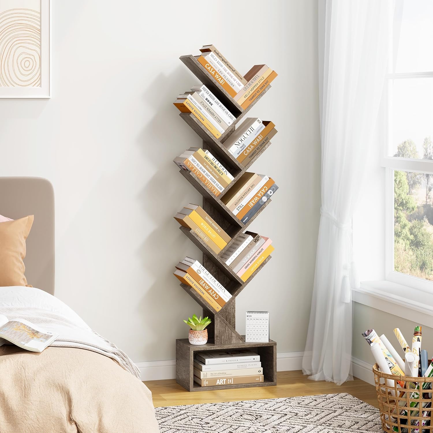 - Space Saving & Ample Storage Capacity: Hoctieon 9-tier tree bookshelf features nine open shelves and a spacious drawer for storage. It provides an ideal solution for organizing books, CDs, magazines, video games, manga, novels, potted plants, photo albums, crafts, and etc. Its slim design allows for easy relocation to any corner or compact area.