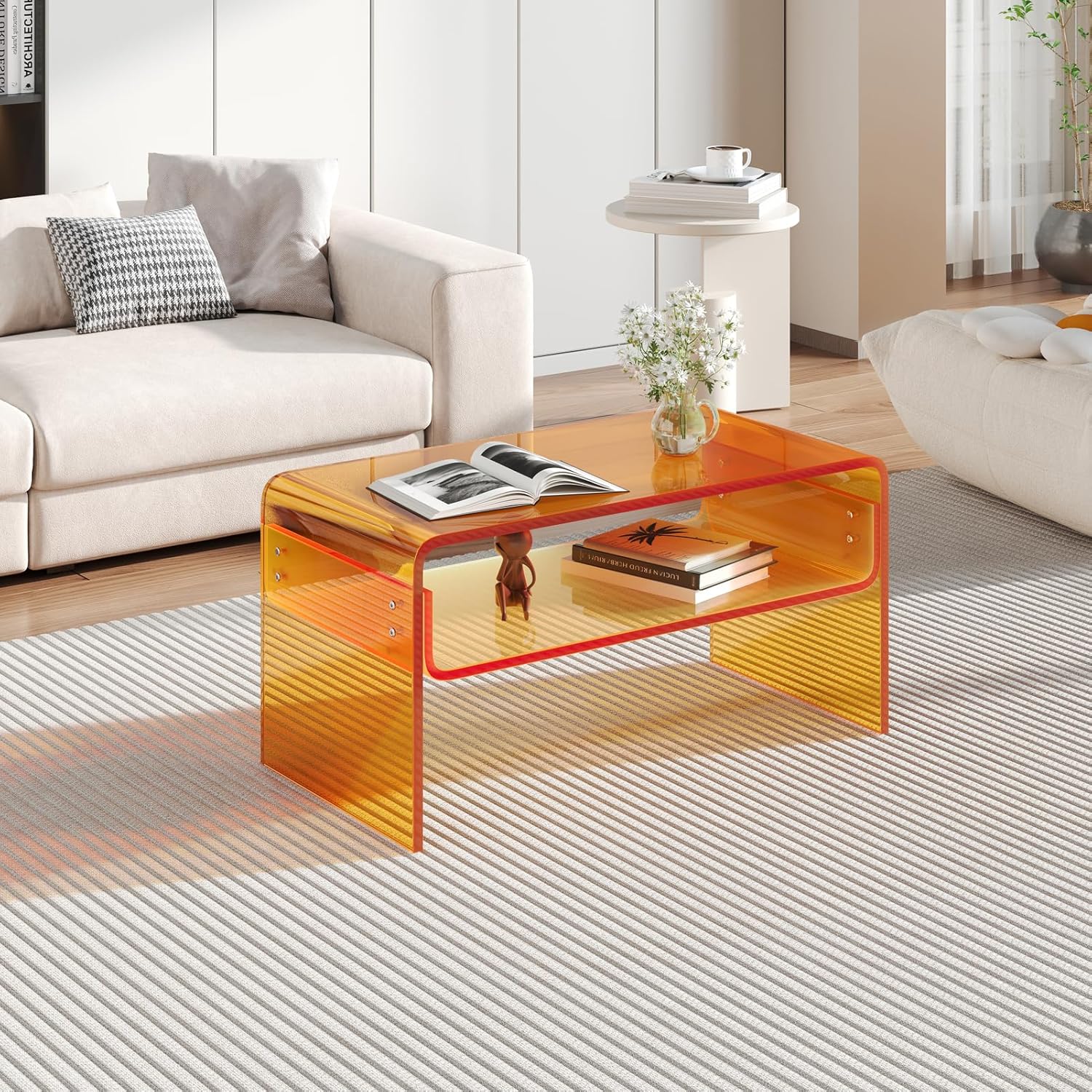Acrylic Coffee Table, Orange Rectangle Acrylic Side Table Furniture, Modern Tea Table with Open Storage, Acrylic End Table for Living Room, Office Reception and Bedroom