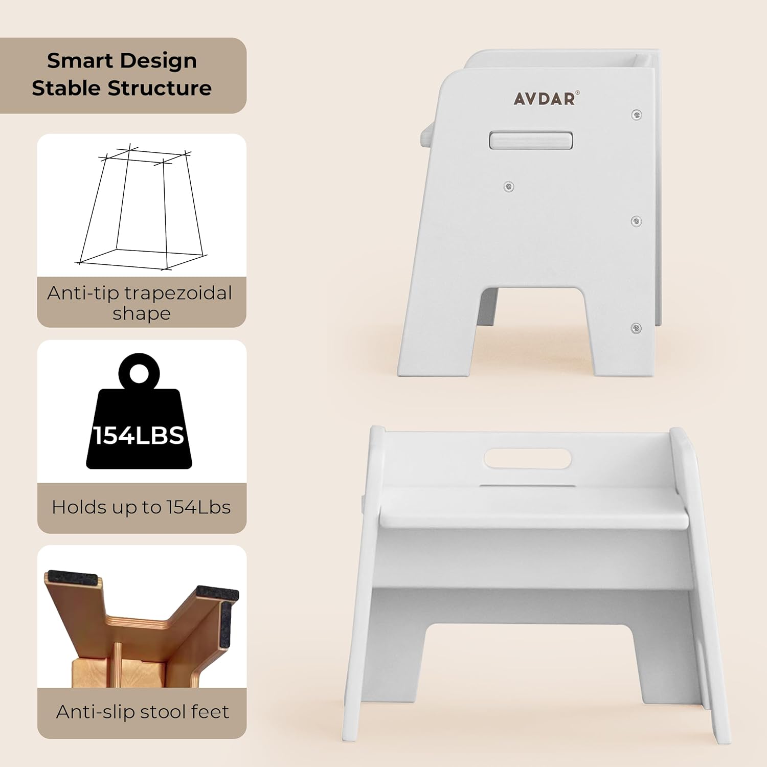 - Stablity and Safety: Our step stool features a trapezoid-shaped design for a stable and secure structure. The reinforced base with support bars significantly increases the weight capacity, allowing a maximum load of 154 lbs for both adults and children. To enhance safety, we've also added non-slip pads to the bottom, ensuring a safe and stable experience while protecting your floors.