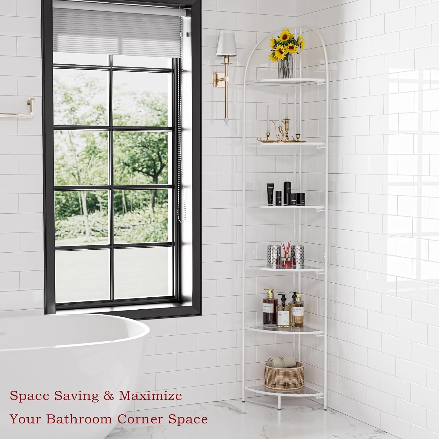 Crofy Foldable 6 Tier Corner Shelf, Metal Corner Plant Stand with White Frame and Transparent Shelves, Corner Display Rack Multipurpose Shelving Unit for Living Room, Bedroom, Bathroom