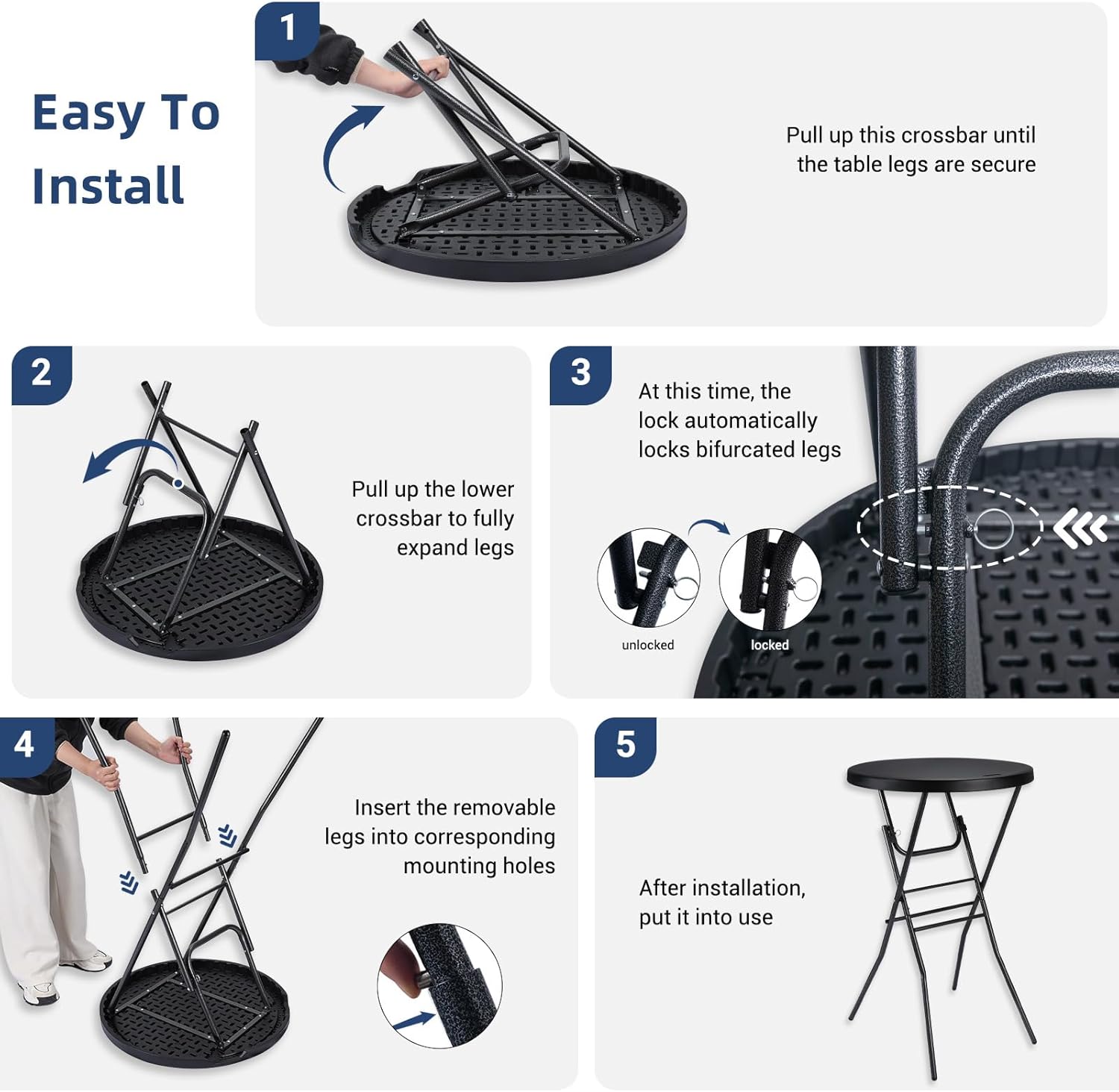 - EASY TO INSTALL: Our round cocktail table can be quickly installed in minutes. Fully pull up the legs attached to the tabletop, insert and lock the split legs in the form of combination rods. After completing, the pub table can be put into use