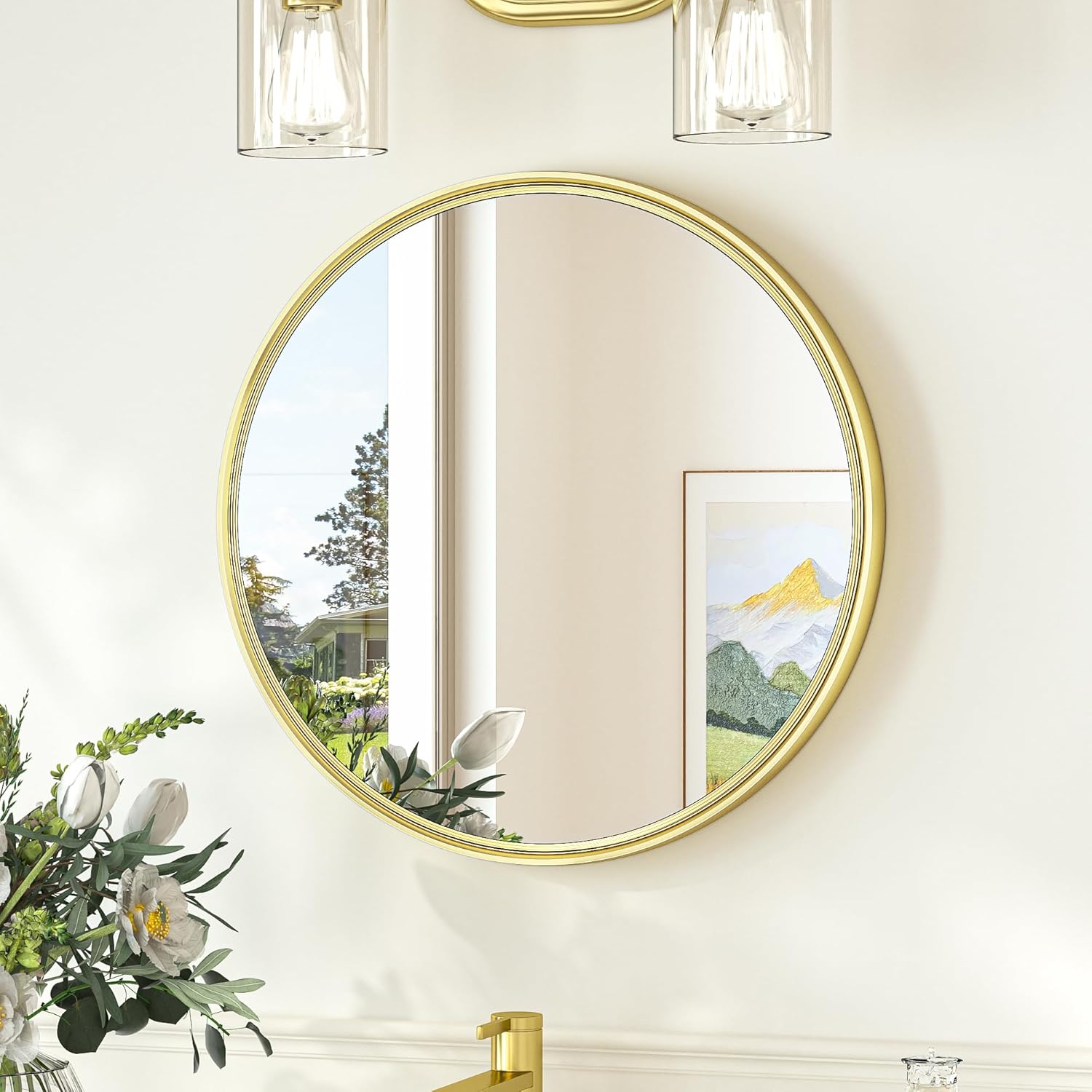 - Built to Last: Engineered with solid glass, this round wall mirror is not only more durable but also more fall-resistant. This wall mirror for bathroom is designed for longevity, making it a reliable addition to your home for years to come.Plus, its waterproof and moisture-proof features make it perfect for high-humidity areas like bathrooms, so you can enjoy a crystal-clear reflection without worry.