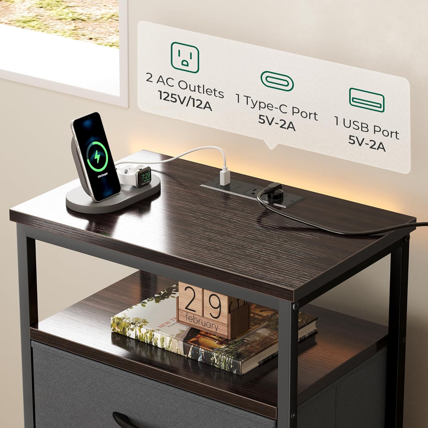 - 【Nightstand with Charger Station】More close charging spots, more handy uses. Equipped with 2 AC outlets, 1 USB port and 1 Type-C port on the tabletop, this fabric dresser allows you to effortlessly charge your devices or lamps overnight, ensuring you wake up worry-free with no low battery concerns. Plus: Contain patent pending drawer slide