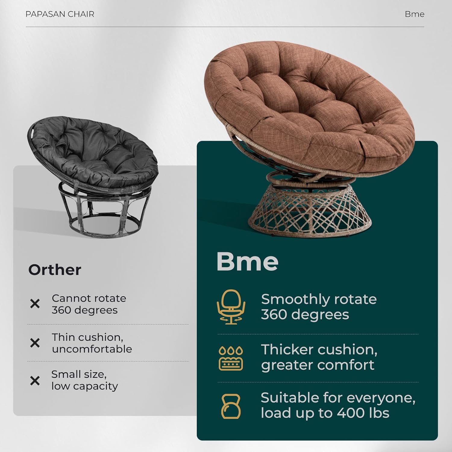 - DURABLE STEEL FRAME: Crafted with sturdy papasan chair frame, this chair supports up to 400 lbs for long-term stability; Its design suits various users, making it dependable choice for a big circle chair or one of your go-to bedroom chair for adults