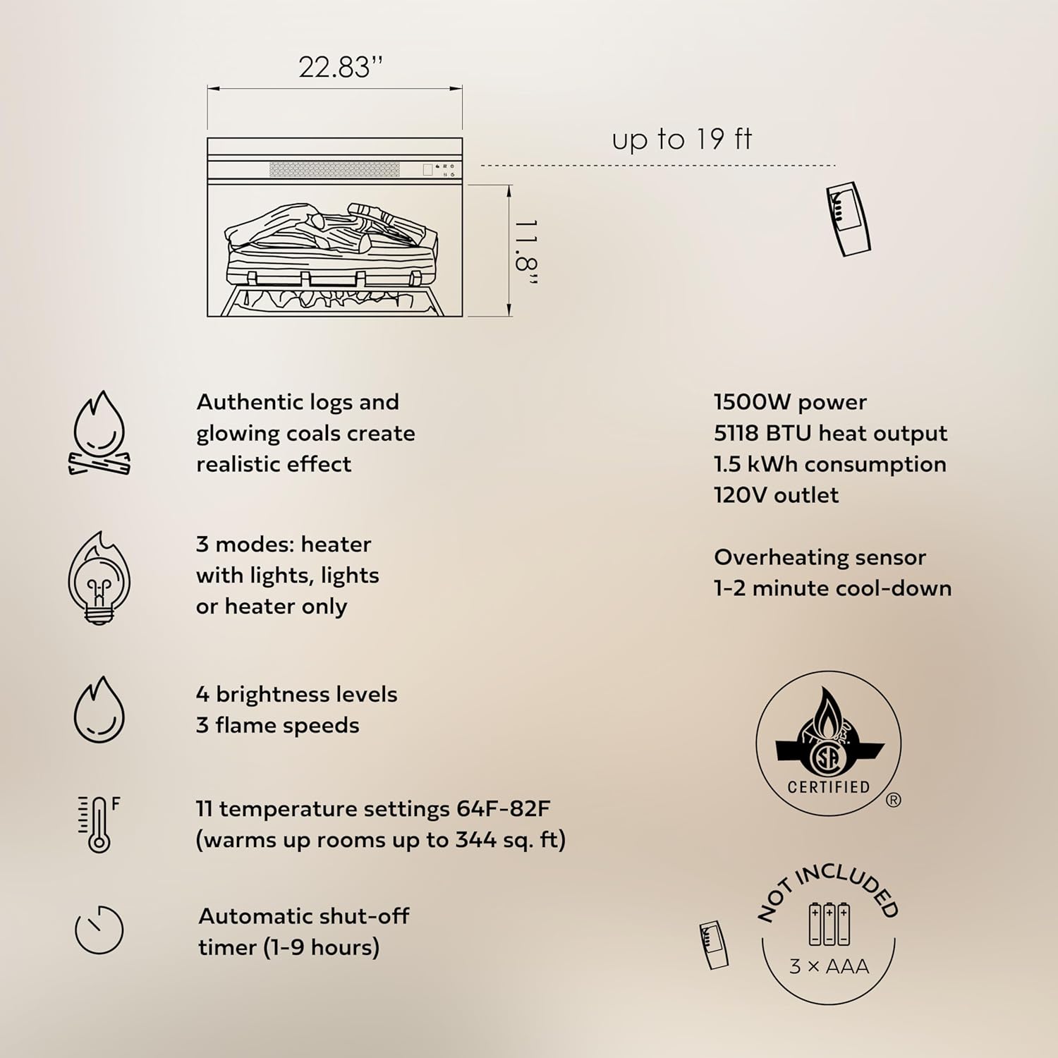 - SET THE MOOD WITH CSA CERTIFIED FIREPLACE featuring a 22.83" x 11.8" glass display and adjustable settings, offering 4 flame brightness and 3 intensity levels, controlled via display or included remote (19-foot range, 2xAAA batteries NOT included). The heater efficiently warms rooms up to 344 sq. ft. with options for heater + lights, lights only, or heater only modes. Additional features include an overheating sensor, 1-2 minute cool-down, and a timer. Technical specs: 1500W, 5118 BTU heat, 1.5 kWh.