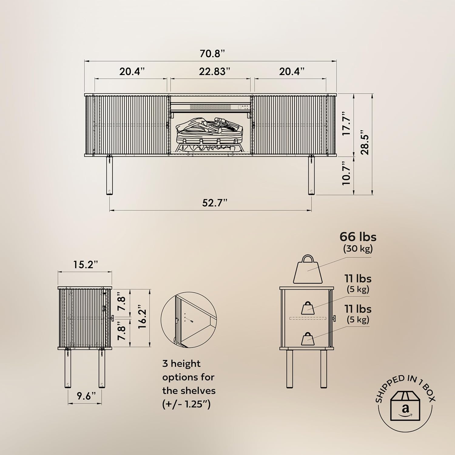 - ENJOY EFFORTLESS STORAGE with this modern electric fireplace TV stand with heater, featuring 2 hidden storage spaces behind sliding doors and an adjustable middle shelf to suit your storage needs. The heated fireplace TV stand (70.8" width x 28.5" height x 15.2" depth) provides easy access to frequently used entertainment essentials. Ships in 1 box from Amazon.