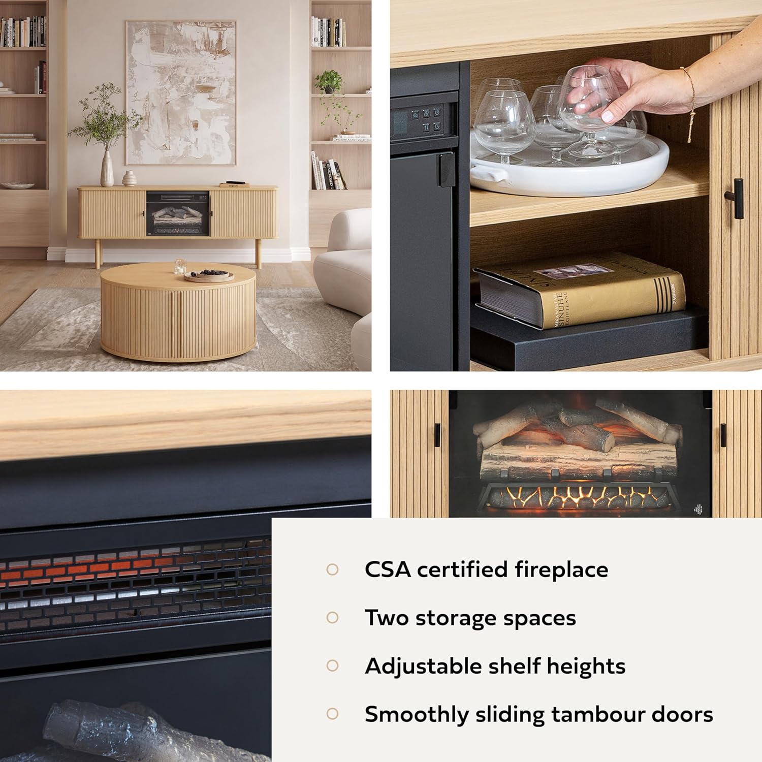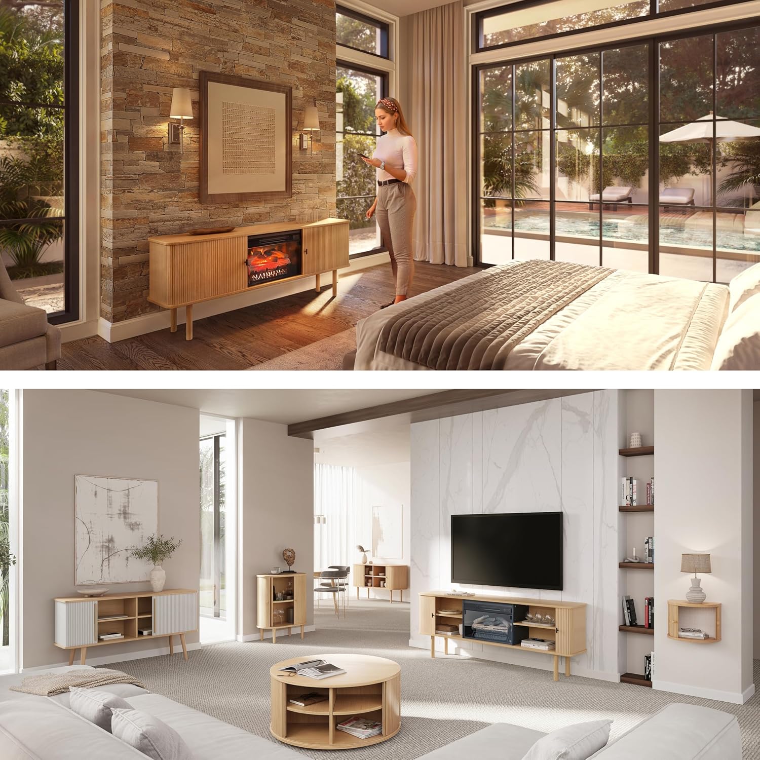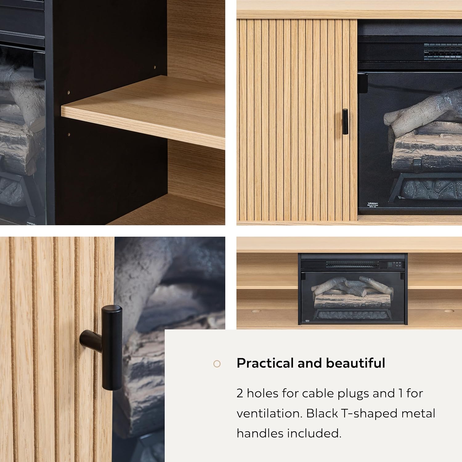 - EXPERIENCE COMFORTABLE TV VIEWING with this TV console fireplace, designed for TVs ranging from 65'' to 75'', while enjoying the realistic effect of authentic-looking logs resting on glowing coals, enhanced by dynamic lighting. The electric fireplace cabinet offers 11 adjustable temperature settings (64°F-82°F) and air circulation is ensured by the two cable holes and a ventilation opening. Black metal T-shaped handles add a stylish touch.