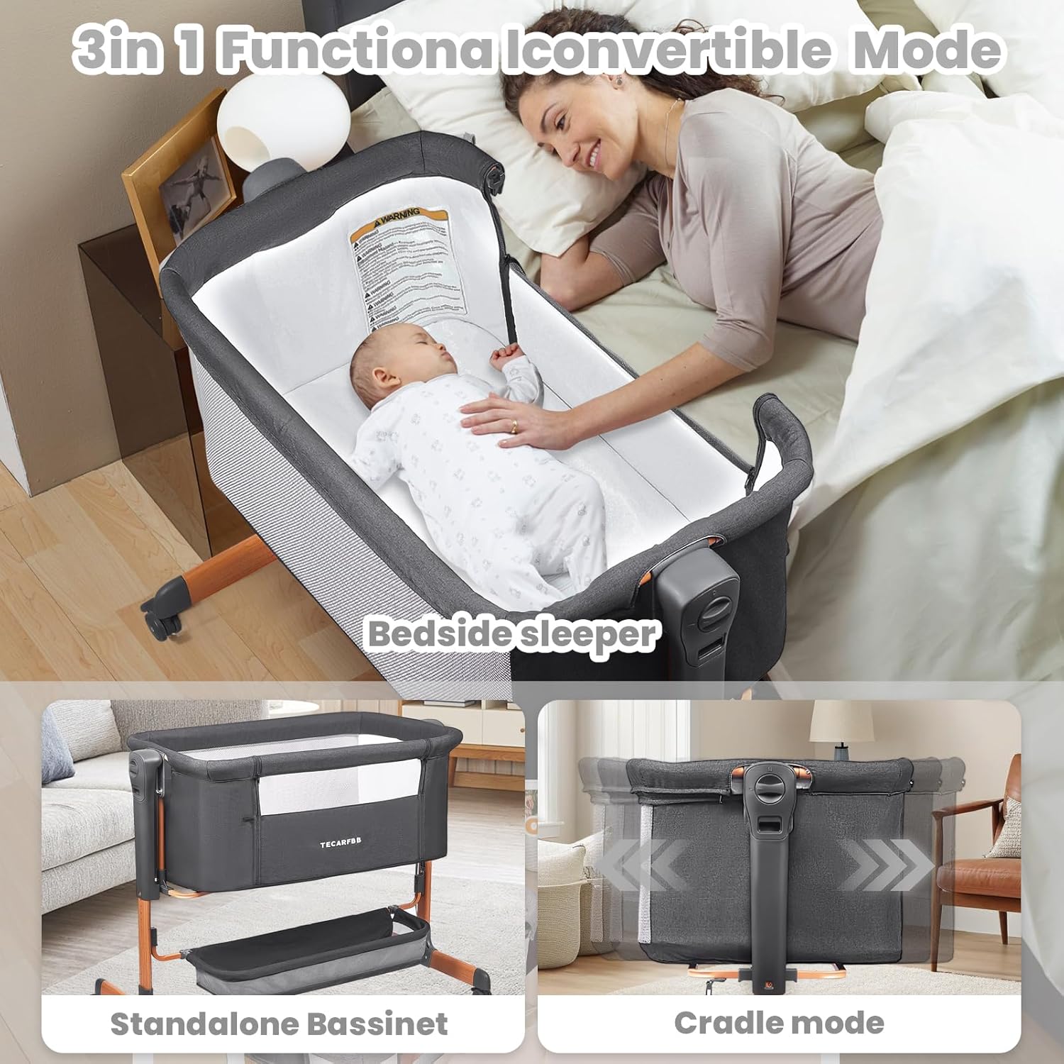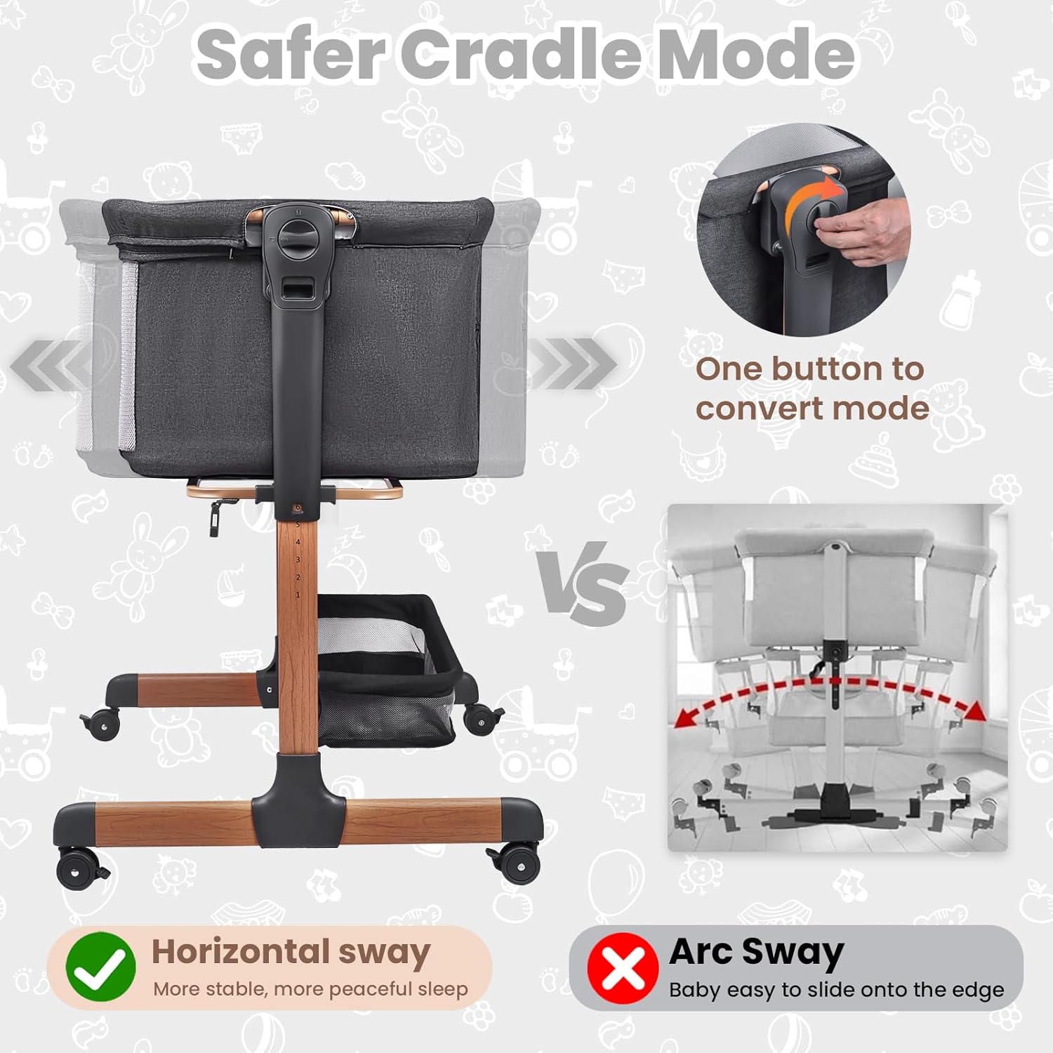 - 3 in 1 Design: Baby Bassinet can be easily converted into 3 modes: Standalone Bassinet--develop habits of sleeping independently; Cradle Mode--mimicking gentle parental rocking to create a tranquil sleeping environment for the baby; Bedside Sleeper--Convenient for looking after babies at night. The bedside bassinet meet will meet baby day & night sleep needs and free mom's hands too