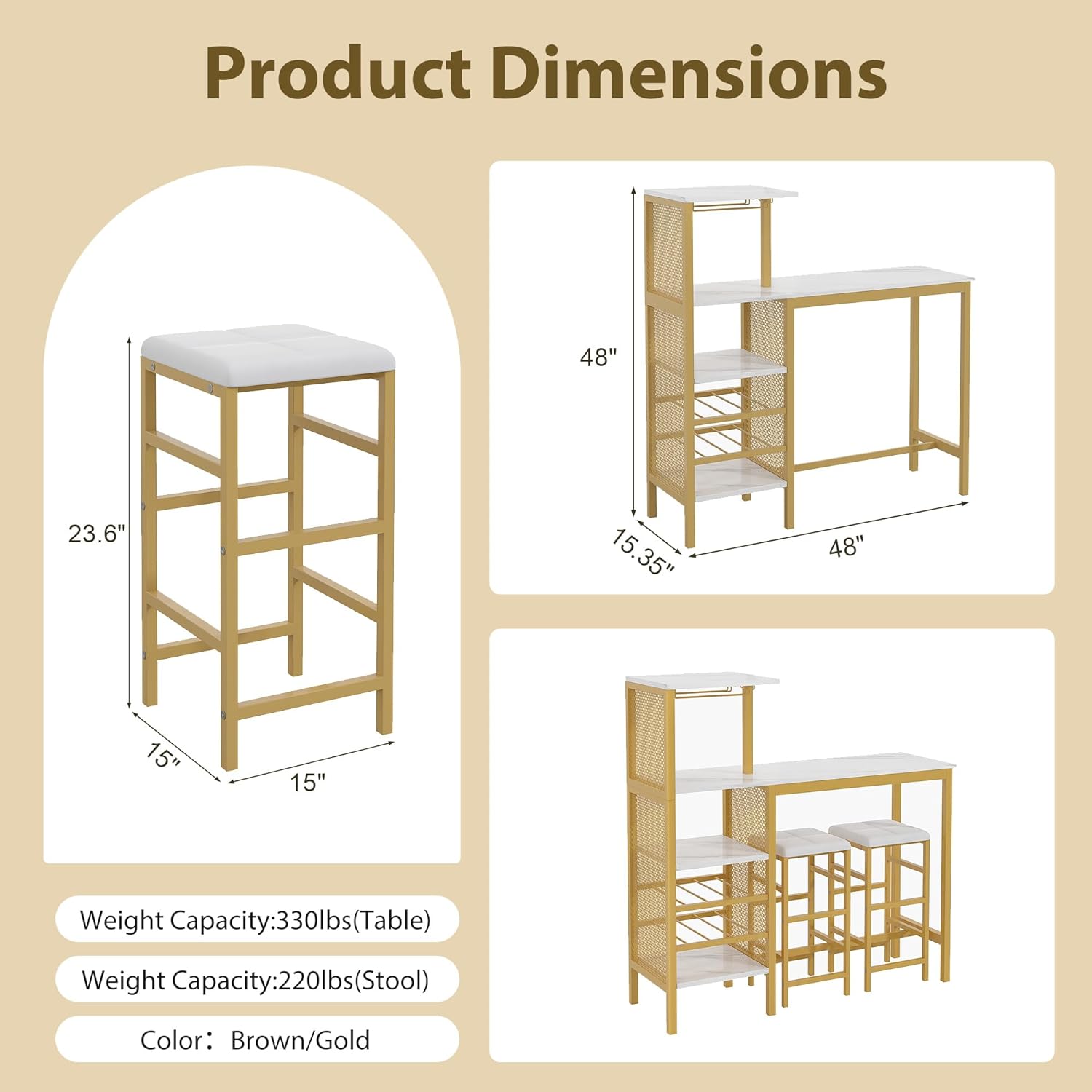 VECELO Bar Table and Chairs Set for 2, 3-Piece Dining Set with Storage Shelves, Cup Holder & Wine Rack, PU Leather Cushion Stools, for Kitchen Small Space, Gold