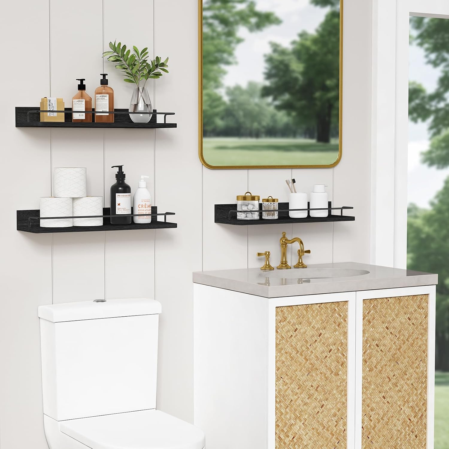 - Premium Material & Guard Rail Design - Forbena bathroom shelves wall mounted are made of high-quality painted solid wood with wood texture feature (Dimension: 17"L x 6"D x 2.2" H). The sturdy black guard rail around that prevents anything from falling. The black floating shelves for wall is durable enough to bear capacity strong up to 18 lbs.