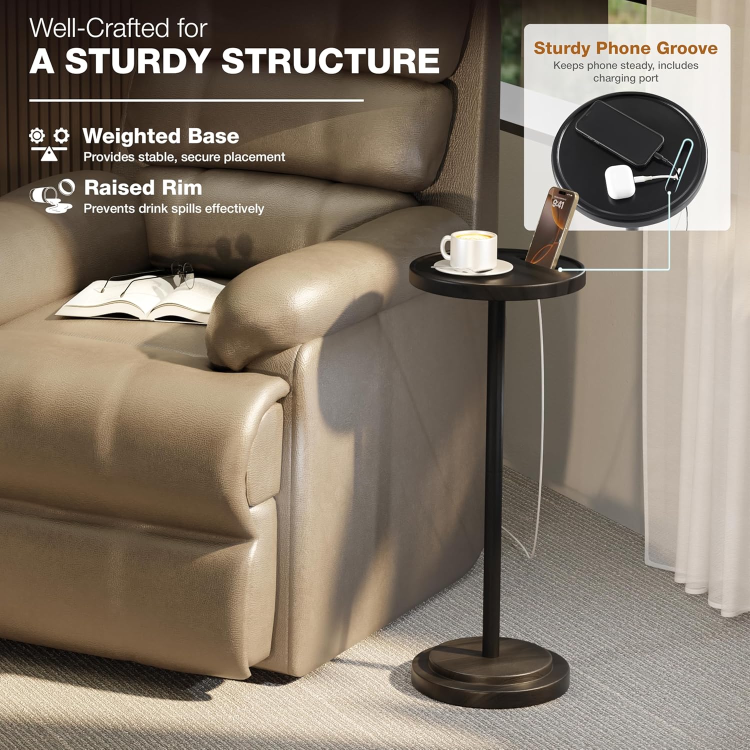 Drink Table, 24.4" Tall Compact Side Table with Phone Slot and Weighted Base, Durable Pedestal Table Accent for Living Room (Stepped Base, Black)