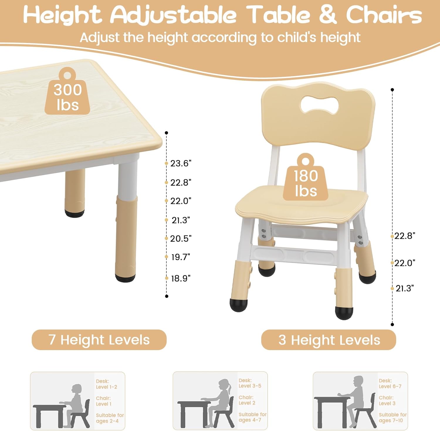 - Grow with Your Little One: The table and chair can adjust the height, the table height ranges from 18.9-23.6in (48-60cm). The chairs are available in 3 heights: 10.2in (26cm), 11in (28cm), 11.8in (30cm). Height-adjustable toddler tables and chairs offer children an optimal height during their growth, which makes it suitable for kids aged 2-10 years old. As your lovely baby grows up, they will always be by your side, and all the wonderful stories of you and your little one will be memorized.
