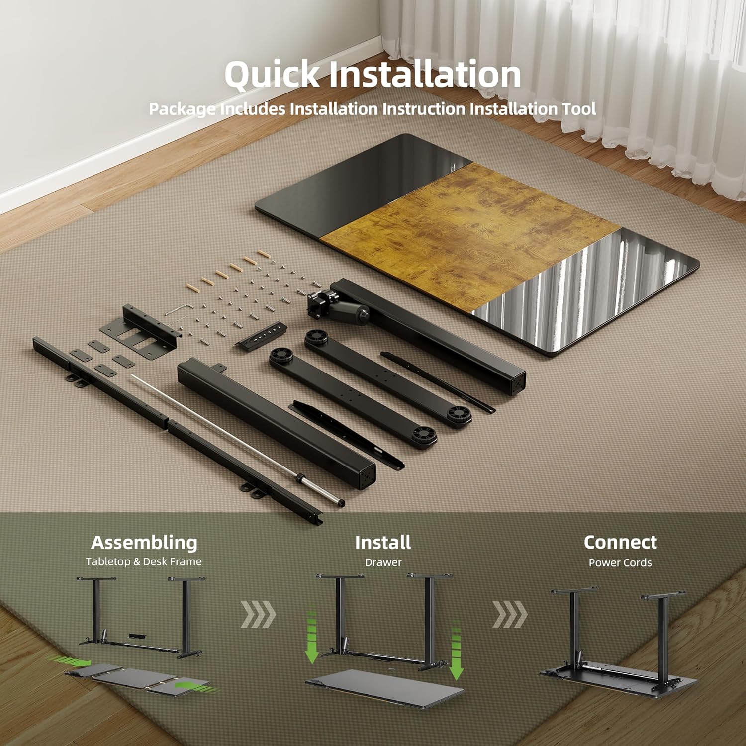 - Simple Assembly: Assembling our glass standing desk is a breeze. Just attach the legs to the top, plug in the power cord, and you're good to go. The desk is capable of supporting up to 132 pounds