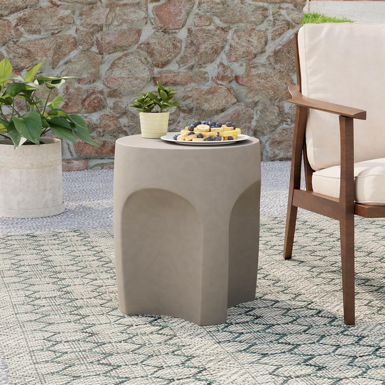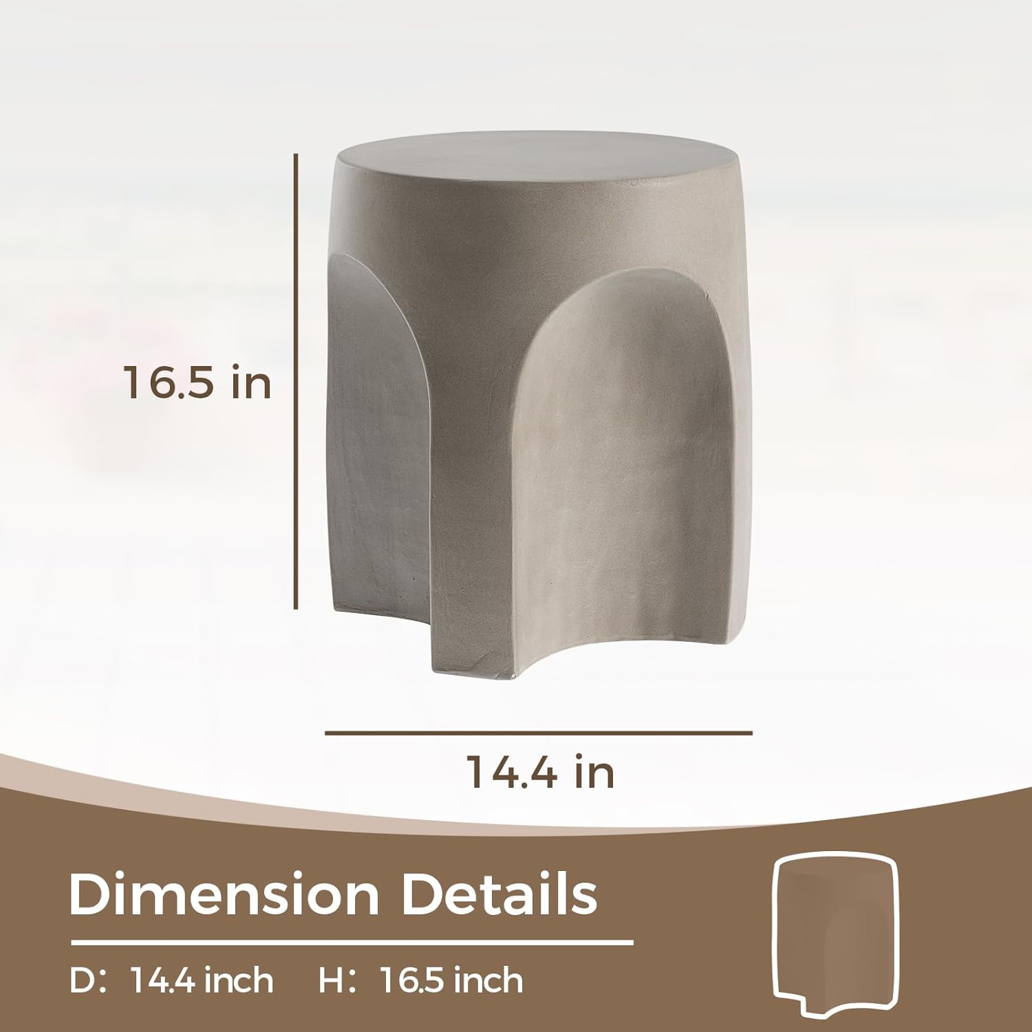 - [Drum Design]Outdoor side table with inspiration taken from a drum shape, patio table is given a sleek modern update. Made from great matrial mgo composite and handcraft, patio side table has deeply carved side arches and a smooth top, it can fit well into your home style and decorate your garden as well.
