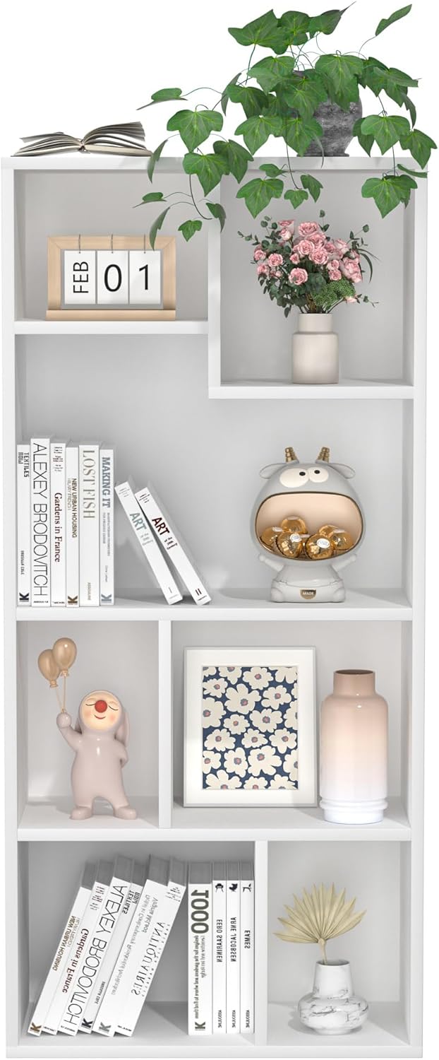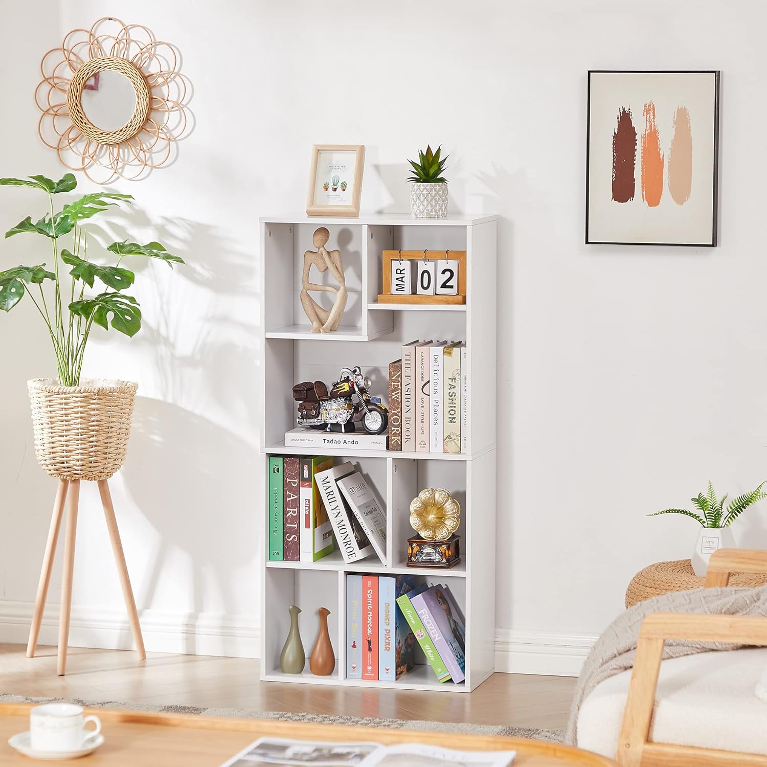 VECELO 42 Inch High Bookcase, 4-Tier Modern Storage Cabinet with Height Difference Shelves for Standard Textbooks, Floor Standing Display, 7 Cubes, Horizontal Avaiable, Easy Assembly, Pearl White