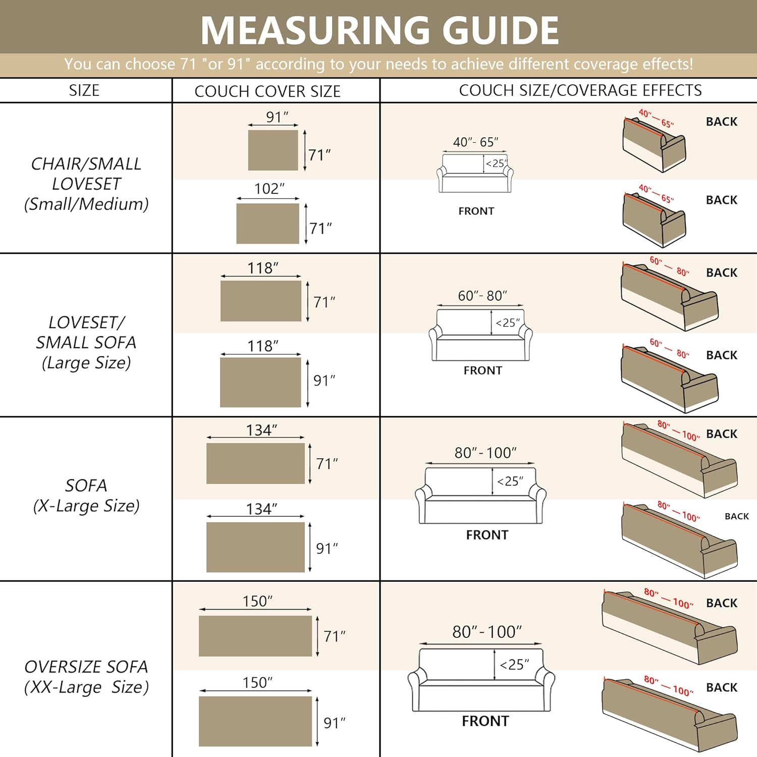 - Product Size: We offer a variety of sizes for you to choose from,Medium Size (71"x91",71"x102") for loveseat sofa futon chair,Large Size (71"x118", 91"x118") for 2-3 seats,X-Large Size (71"x134", 91"x134") for 3 seats, XX-Large Size (91"x150") for 4 seats, choose the right size according to the actual sofa size. You can choose 71" or 91" according to your needs to achieve different coverage effects!