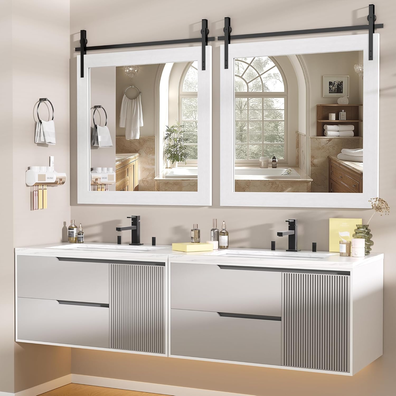 Hasipu Farmhouse Bathroom Mirror, 31"x31" Rustic Wood Framed Wall Mounted Mirror, White Vintage Vanity Mirror Barn Door Style Decrative Mirrors
