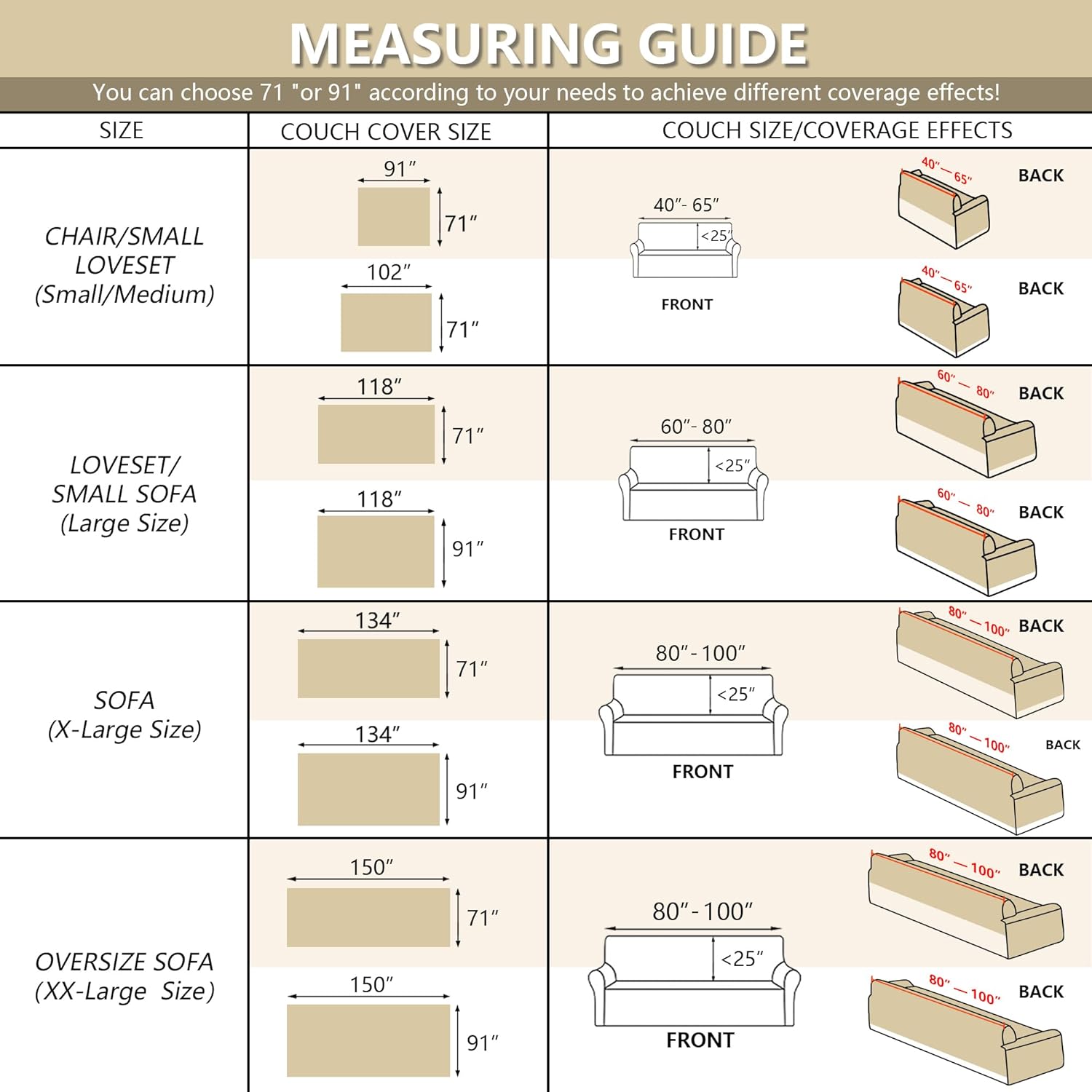 - Product Size: We offer a variety of sizes for you to choose from,Medium Size (71"x91",71"x102") for loveseat sofa futon chair,Large Size (71"x118", 91"x118") for 2-3 seats,X-Large Size (71"x134", 91"x134") for 3 seats, XX-Large Size (91"x150") for 4 seats, choose the right size according to the actual sofa size. You can choose 71" or 91" according to your needs to achieve different coverage effects!