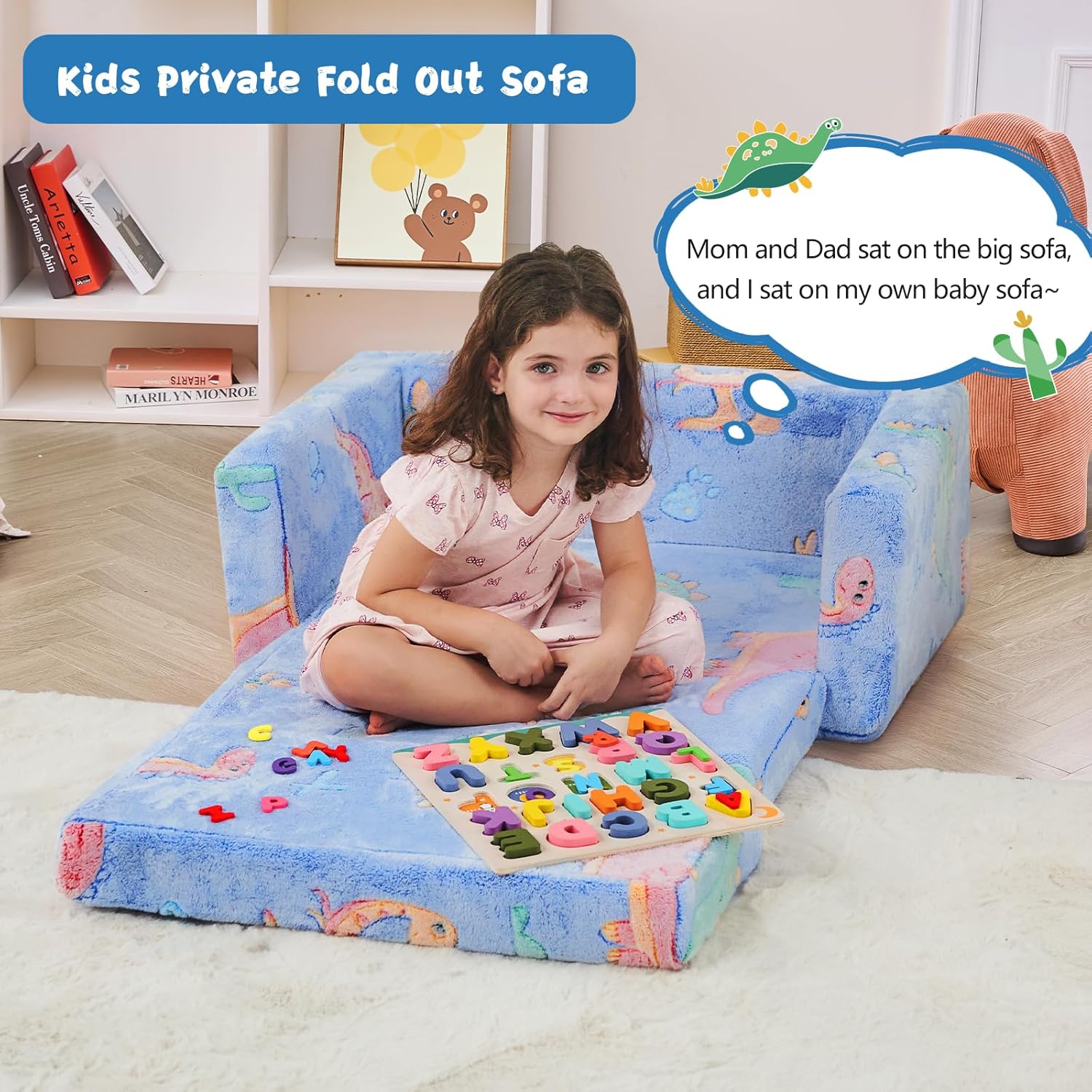 - Dinosaur Flip out Couch:Every family with baby may need a toddler sofa,our dinosaur furniture is a great choice.Dinosaur chair can be a kids chair and sofa bed or a nap pad.and is a toddler bedroom essentials for boys and girls.It's a fun place for kids sitting ,reading ,eating,watch TV, play games, relax, or sleep and can also be used as a cat dog bed