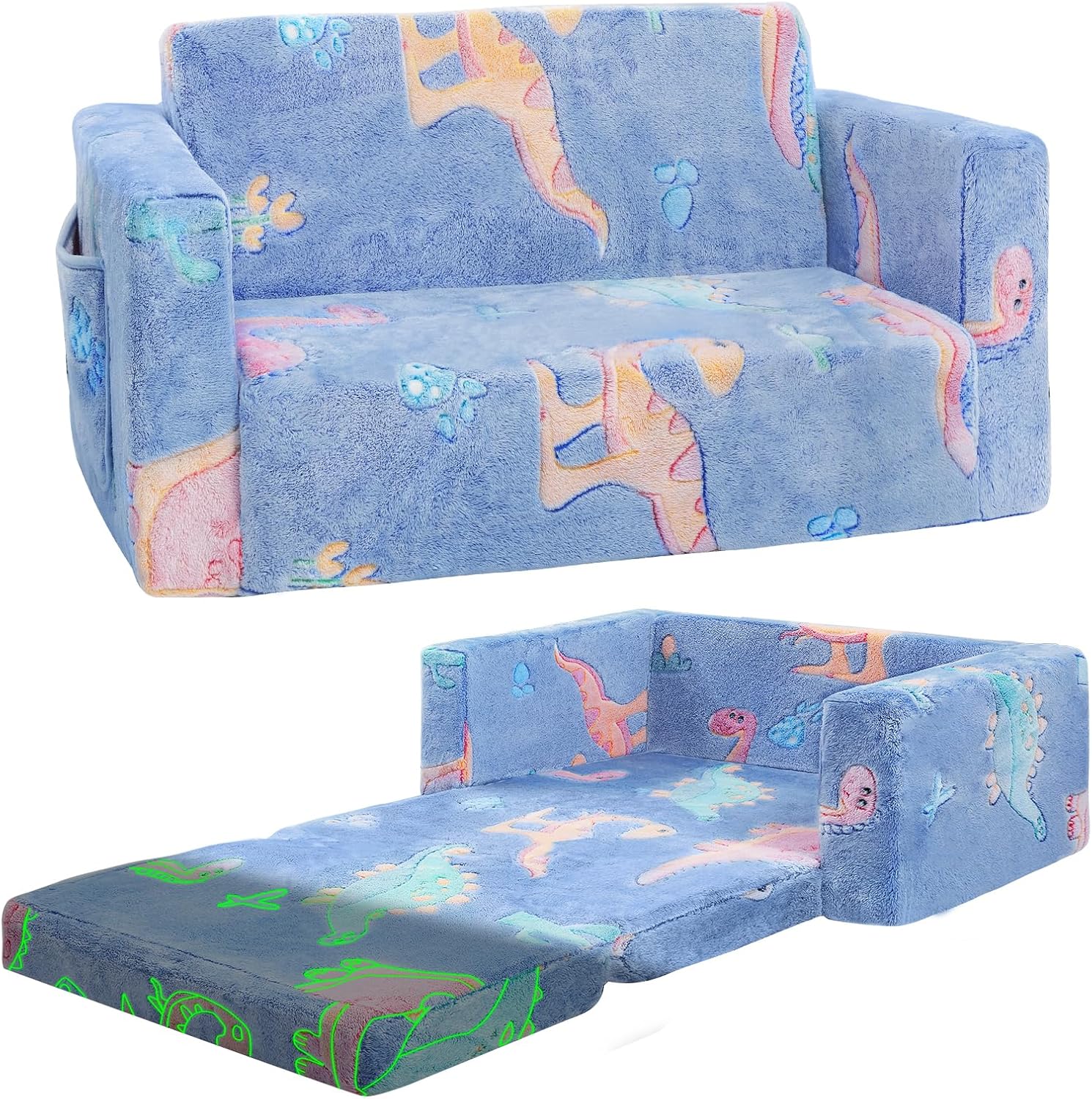 Toddler Couch,Toddler Chair,Extra Wider Seating,2-in-1 Baby Seat Furniture Fold Out, Convertible Sofa to Lounger Comfy Glow in The Dark Sofa Bed,Gifts for Kids Girl Boys,Dinosaur,Large