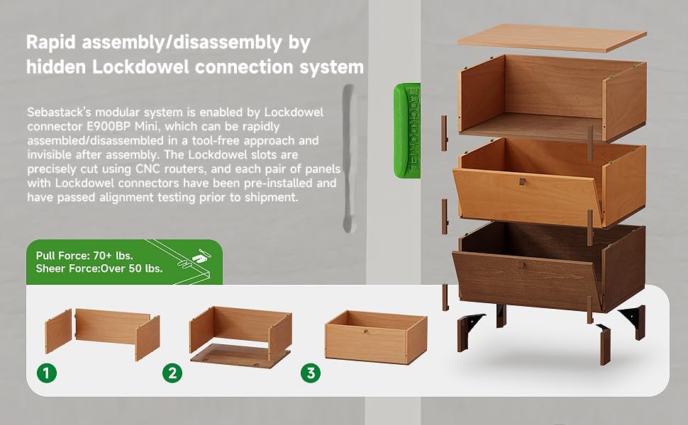 - 【Hidden Lockdowel System】This home end table modular system is empowered by high-quality Lockdowel hidden connector E900BP Mini, allowing for rapid assembly and disassembly without tools, and remains invisible once assembled. The Lockdowel slots are precisely cut using CNC routers. This hidden connector system ensures a tidy and aesthetically pleasing finish, creating a seamless and unified appearance that enhances any modern living space