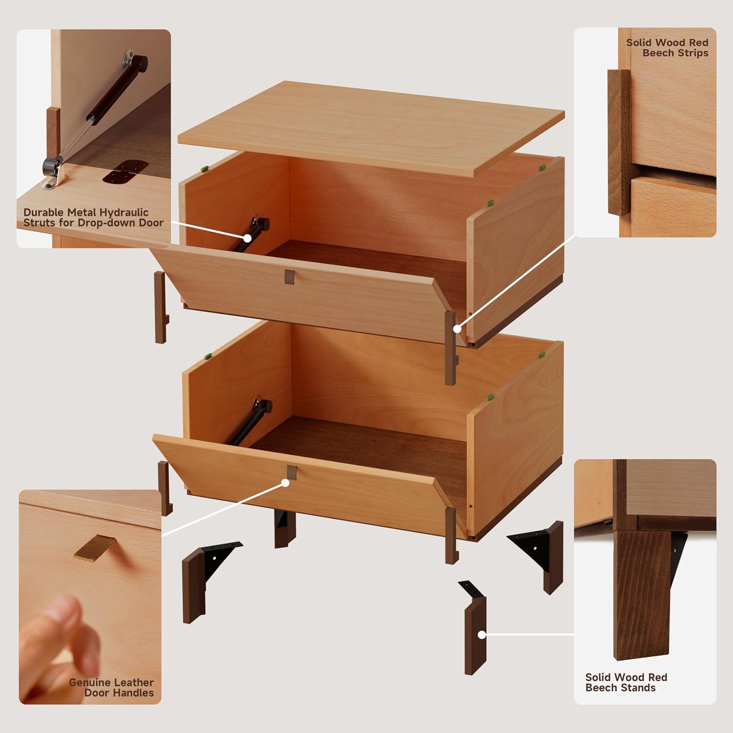 - 【Drop-Down Door Design】This night stand features a unique drop-down door design that maximizes drawer space to increase storage capacity. Equipped with genuine leather handles and durable metal hydraulic struts, it seamlessly integrates aesthetics and practicality. The sleek and sophisticated design of this bedside table effortlessly complements a variety of living space, whether in the bedroom, living room, or dormitory