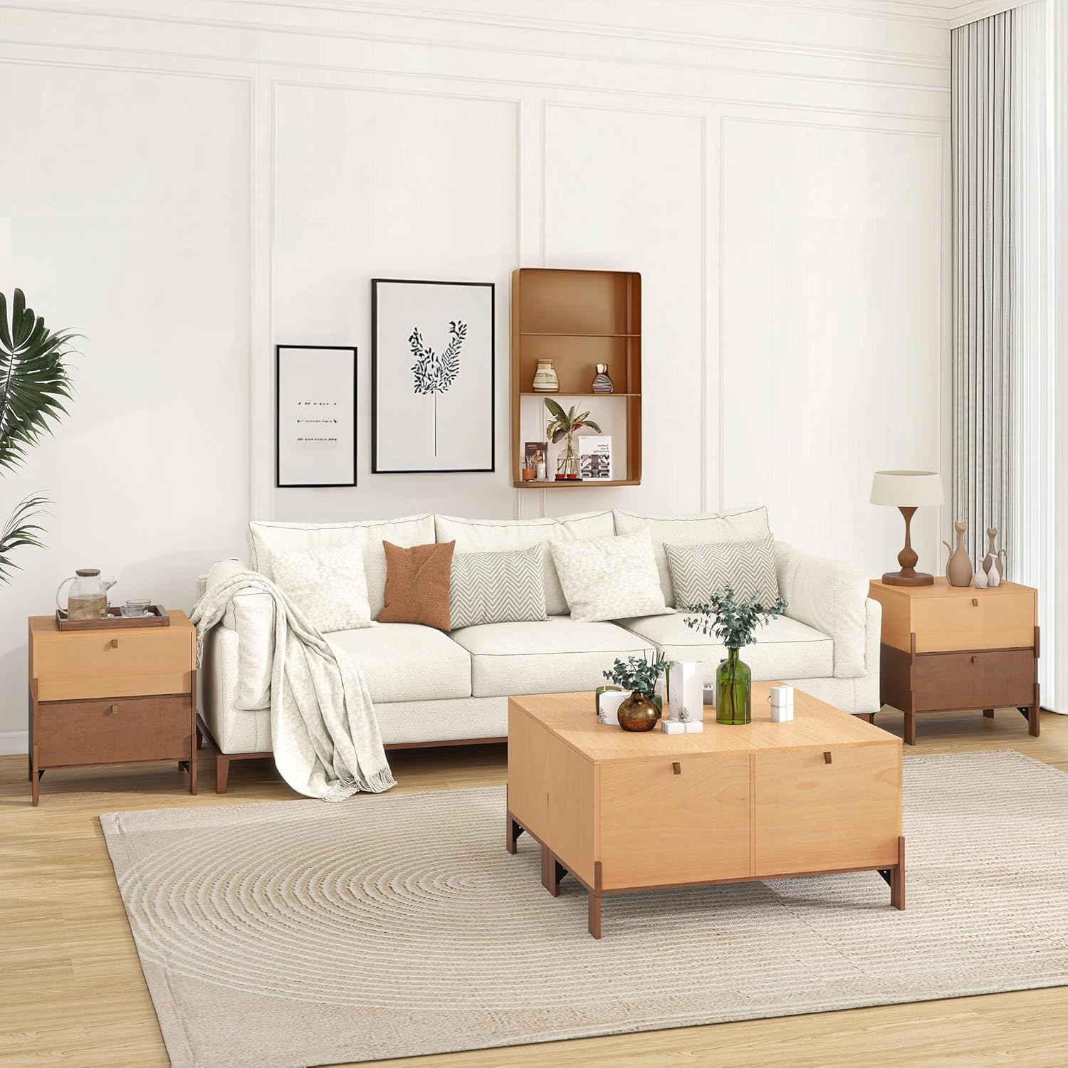 Sebastack Night Stand, Customizable 2 Drawers Bedside Table, End Table, Side Table for Bedroom, Dormitory, Mid-Century Style Wood Chest of Furnitures, Beech and Walnut Color Combo