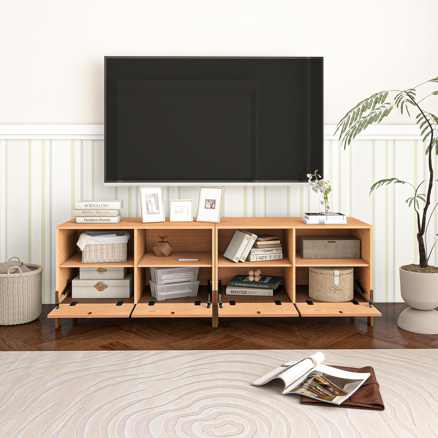 - 【Drop-Down Door Design】This TV stand features a unique drop-down door design that maximizes drawer space to increase storage capacity. Equipped with genuine leather handles and durable metal hydraulic struts, it seamlessly integrates aesthetics and practicality. The sleek and sophisticated design of this home monitor stand effortlessly complements a variety of living space, whether in the living room, bedroom, or office