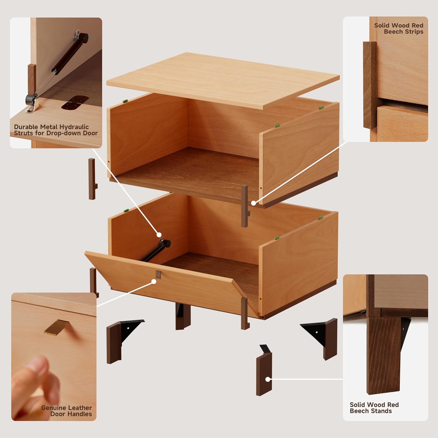 - 【Drop-Down Door Design】This night stand features a unique drop-down door design that maximizes drawer space to increase storage capacity. Equipped with genuine leather handles and durable metal hydraulic struts, it seamlessly integrates aesthetics and practicality. The sleek and sophisticated design of this bedside table effortlessly complements a variety of living space, whether in the bedroom, living room, or dormitory